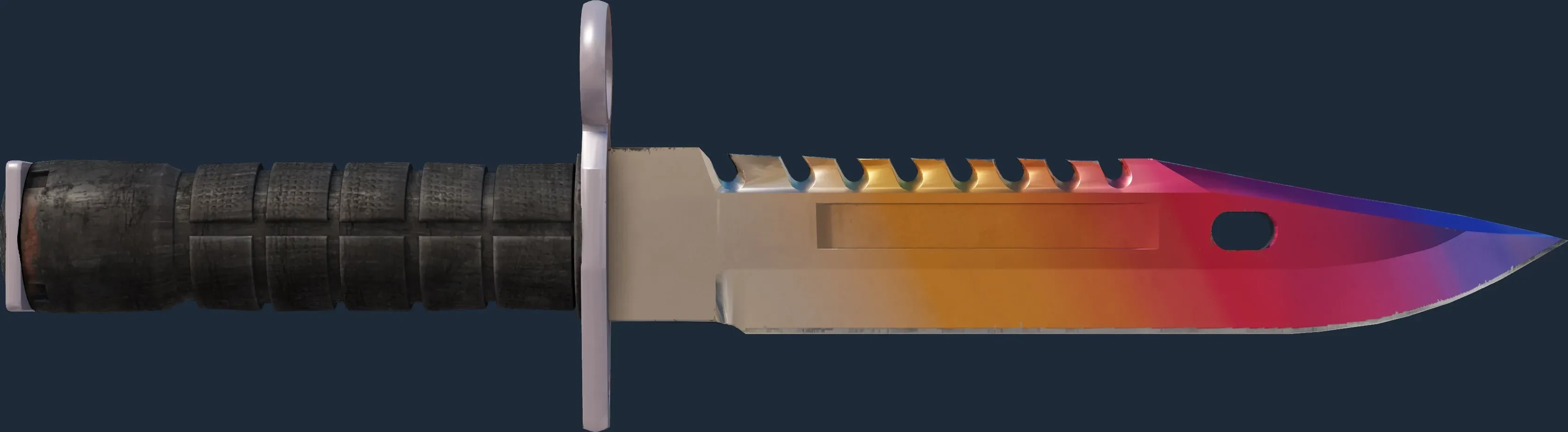 The M9 Bayonet | Fade is a Covert grade skin for the M9 Bayonet in Counter-Strike 2. It features a Custom Paint Job finish and was designed by Valve.