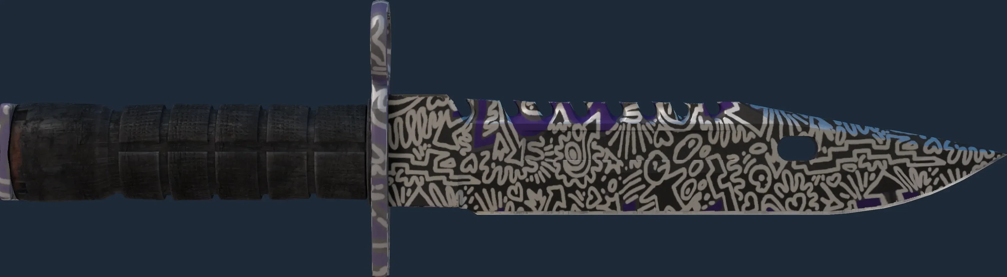 This M9 Bayonet has been painted in a "Anodized Multicolored" style, with the Freehand finish. In this style, the candy coat may be applied in a multicolored pattern. In the real world, methods could include silk-screening or adherable stencils. The look of the Freehand finish is affected by its pattern index. The skin uses the old legacy model.