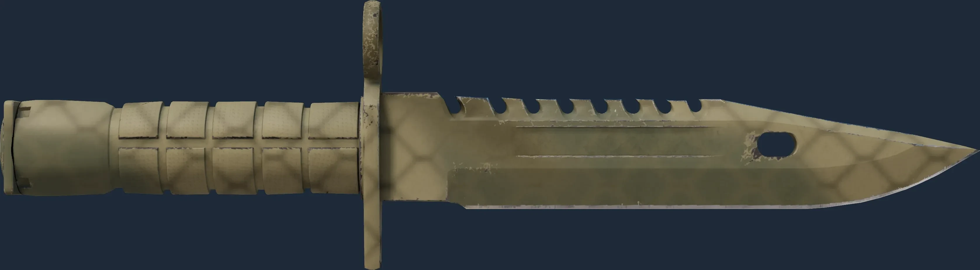 The M9 Bayonet | Safari Mesh is a Covert grade skin for the M9 Bayonet in Counter-Strike 2. It features a Custom Paint Job finish and was designed by Valve.