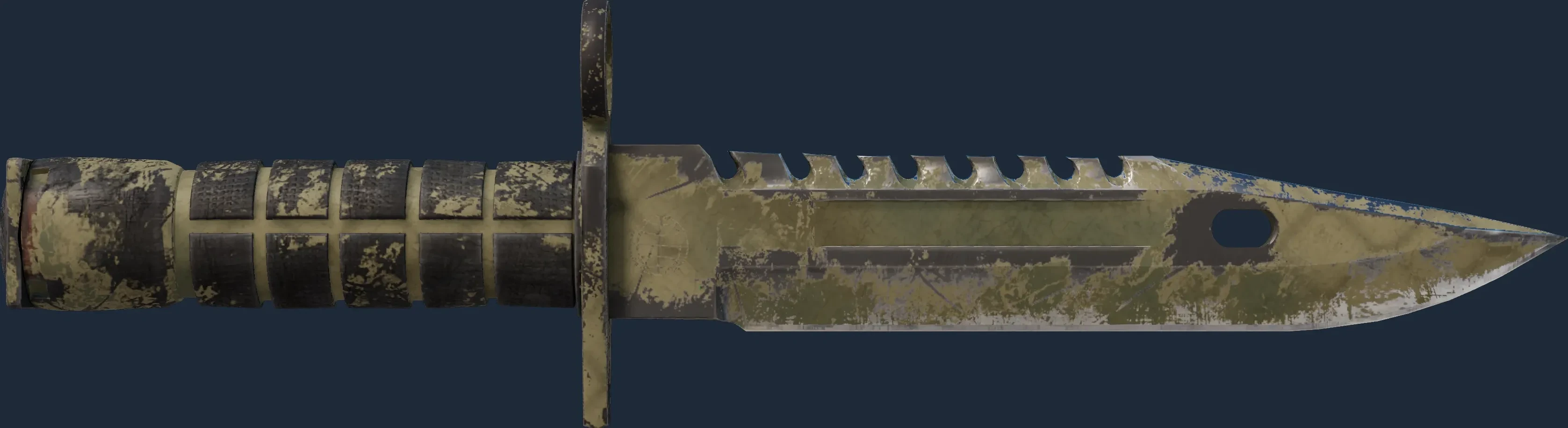The M9 Bayonet | Safari Mesh is a Covert grade skin for the M9 Bayonet in Counter-Strike 2. It features a Custom Paint Job finish and was designed by Valve.