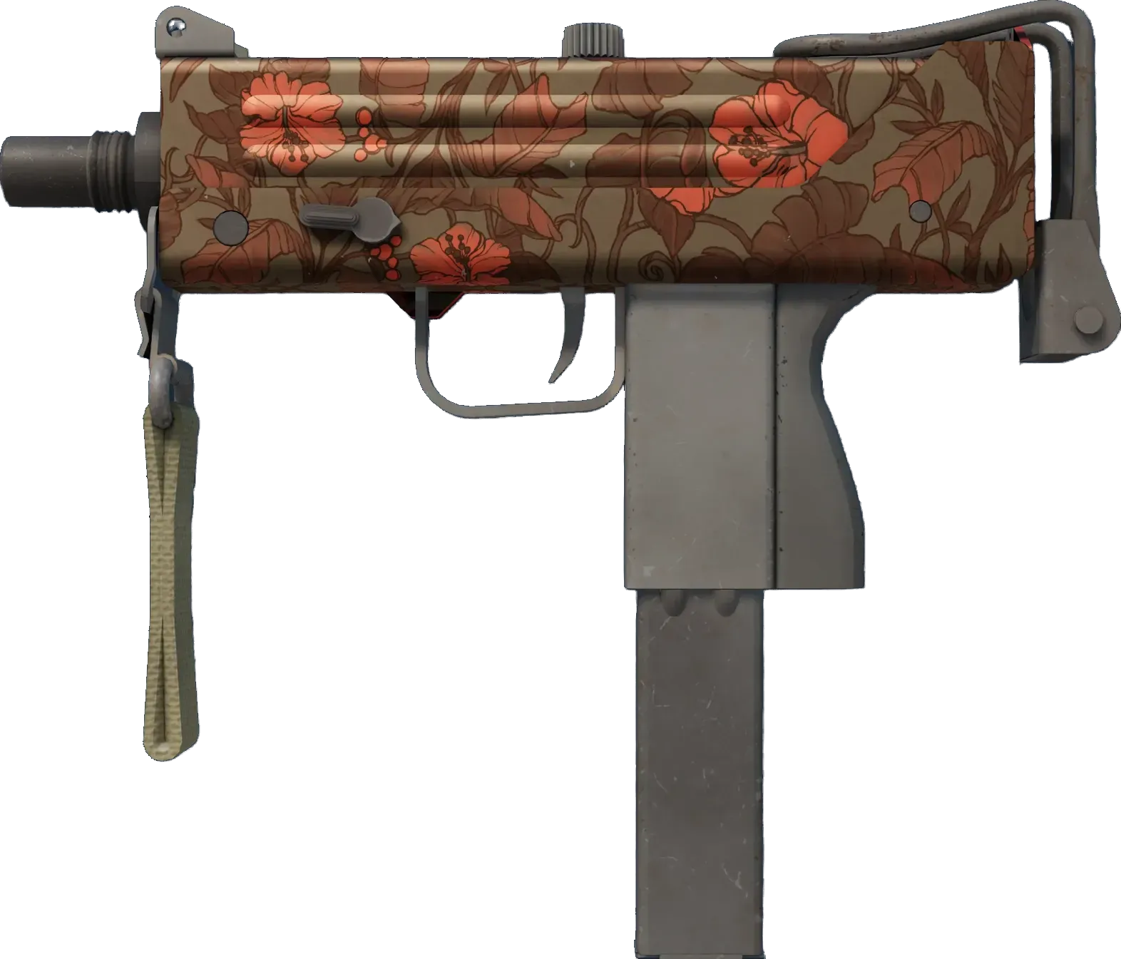 Essentially a box that bullets come out of, the MAC-10 SMG boasts a high rate of fire, with poor spread accuracy and high recoil as trade-offs. It has been airbrushed with a red hibiscus pattern. _For the noncommittal_