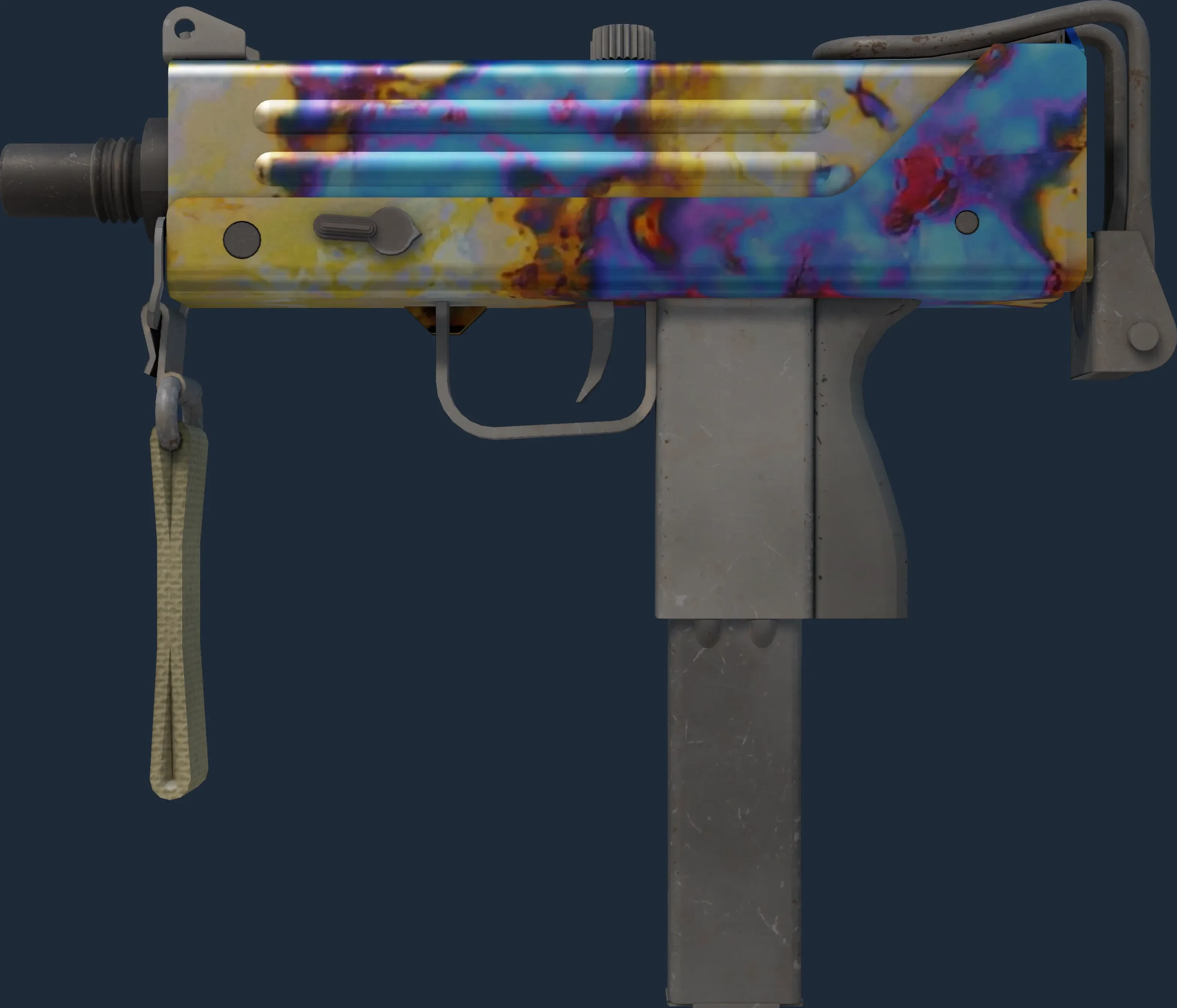 This MAC-10 has been painted in a "Patina" style, with the Case Hardened finish. A patina is a chemical reaction that forms a non-reactive, hardened shell over metallic parts. Real-life weapon patinas include case hardening, cold bluing, and acid forced patinas. The look of the Case Hardened finish is affected by its pattern index. The skin uses the old legacy model.