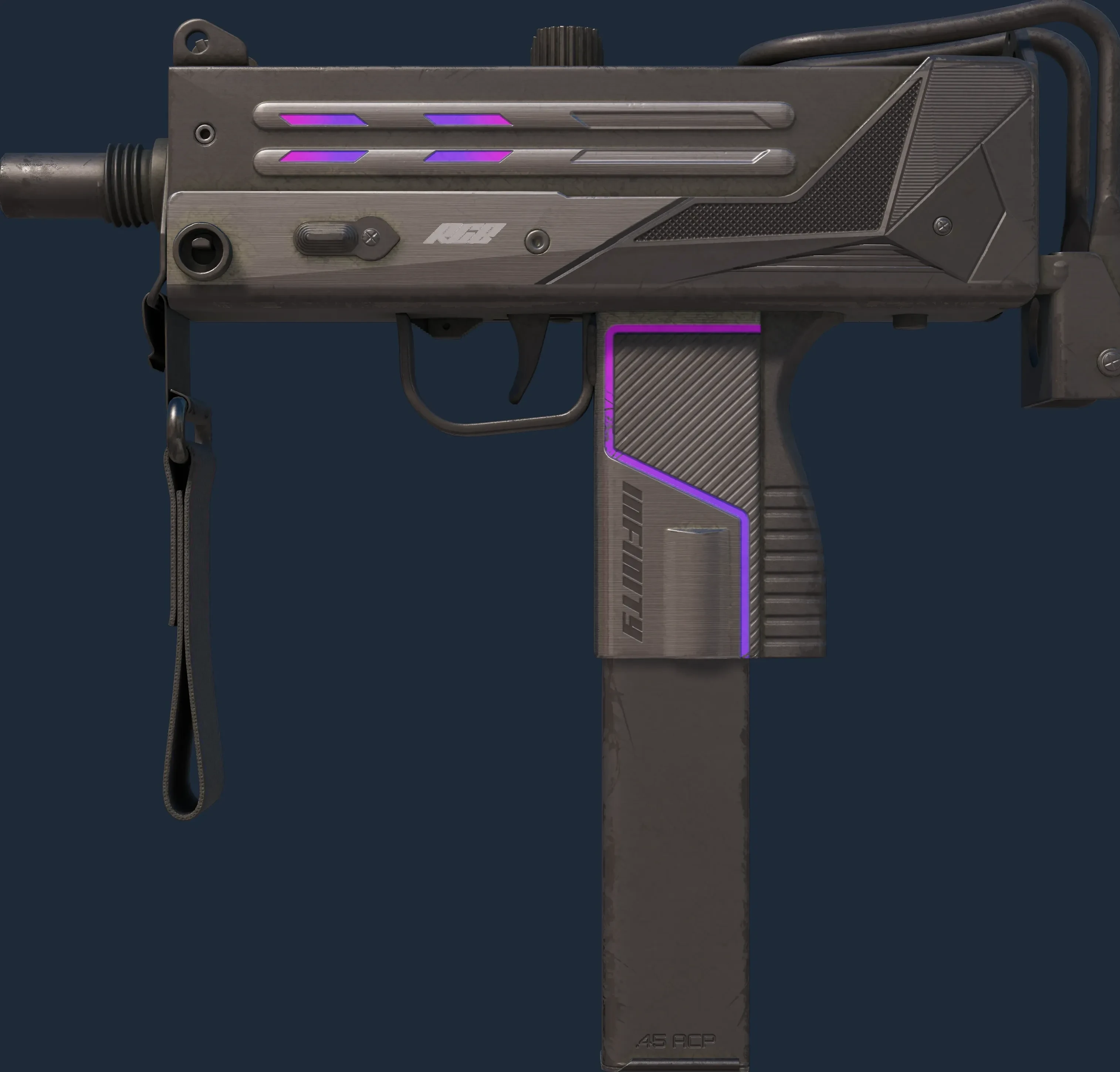 This MAC-10 has been painted in a "Gunsmith" style, with the Light Box finish. This style uses a combination of patina and custom paint styles. That said, this particular skin has been mostly painted in shades of black. Different pattern indexes have no effect on the Light Box finish. The skin uses the new CS2 model.