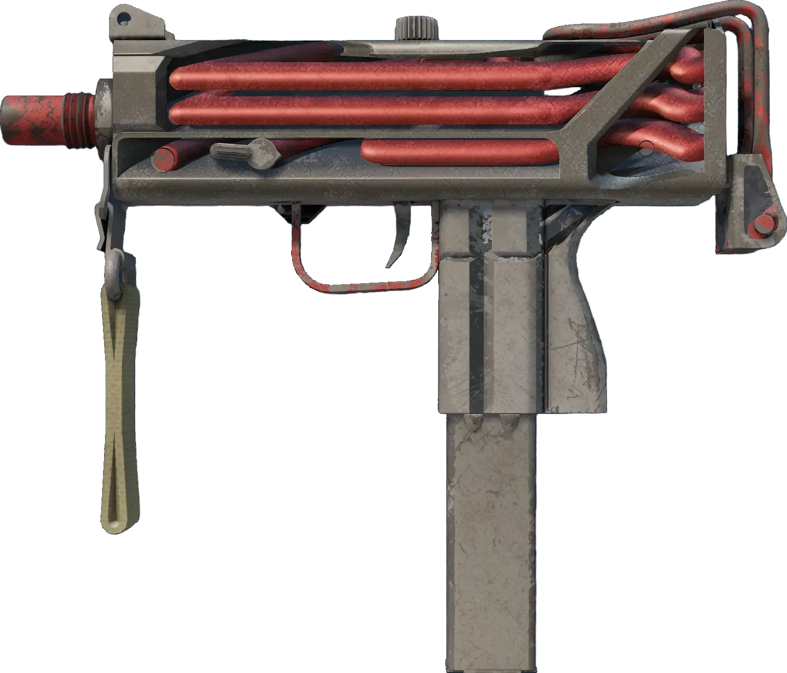 Essentially a box that bullets come out of, the MAC-10 SMG boasts a high rate of fire, with poor spread accuracy and high recoil as trade-offs. It has been custom painted to appear as if it is filled with red tubes. _Peek behind the curtain_