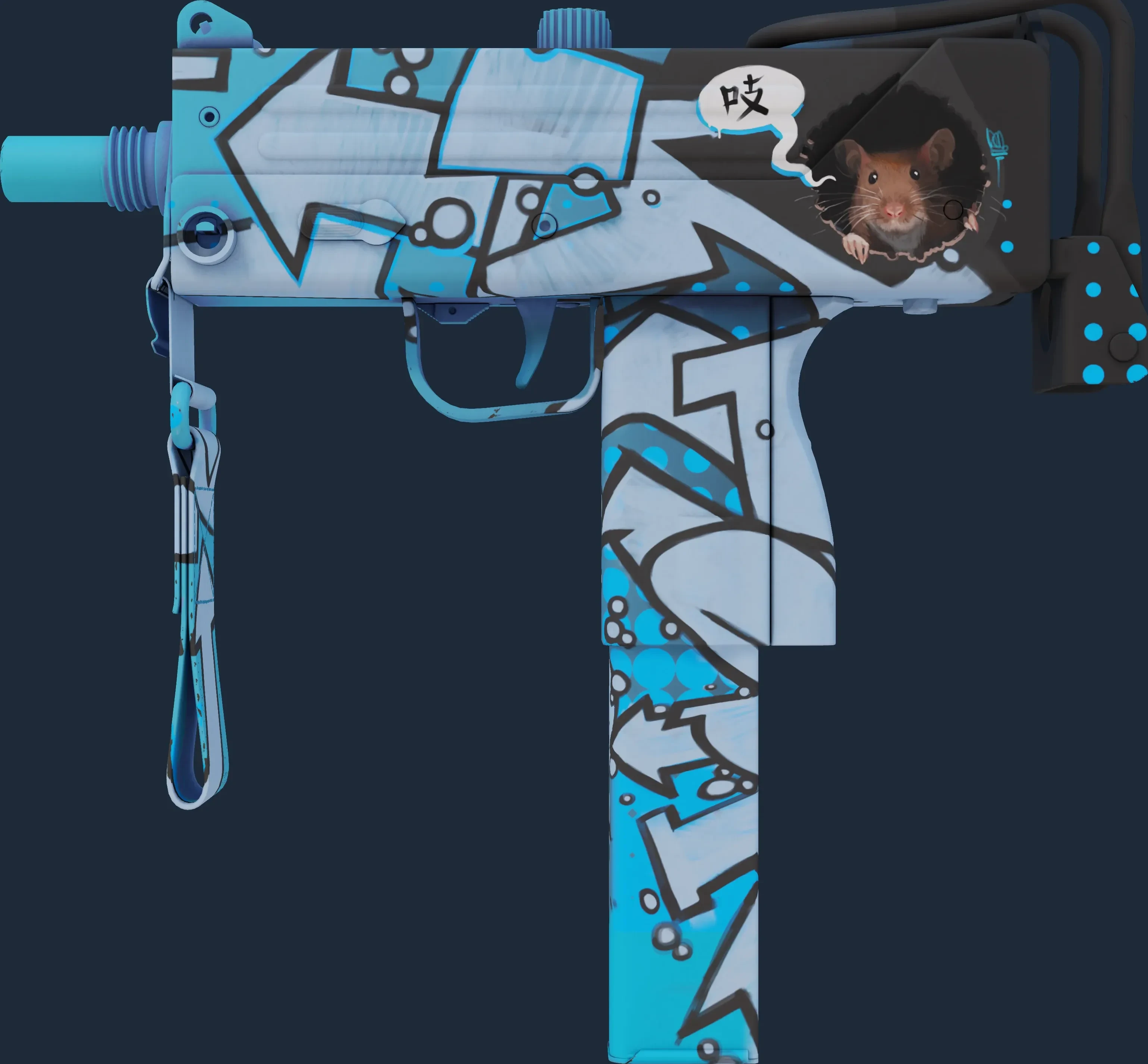 This MAC-10 has been painted in a "Custom Paint Job" style, with the Pipsqueak finish. This style enables extremely customized looks in a full range of colors. The primary color of this skin is composed of a cyan tint. Different pattern indexes have no effect on the Pipsqueak finish. The skin uses the new CS2 model.