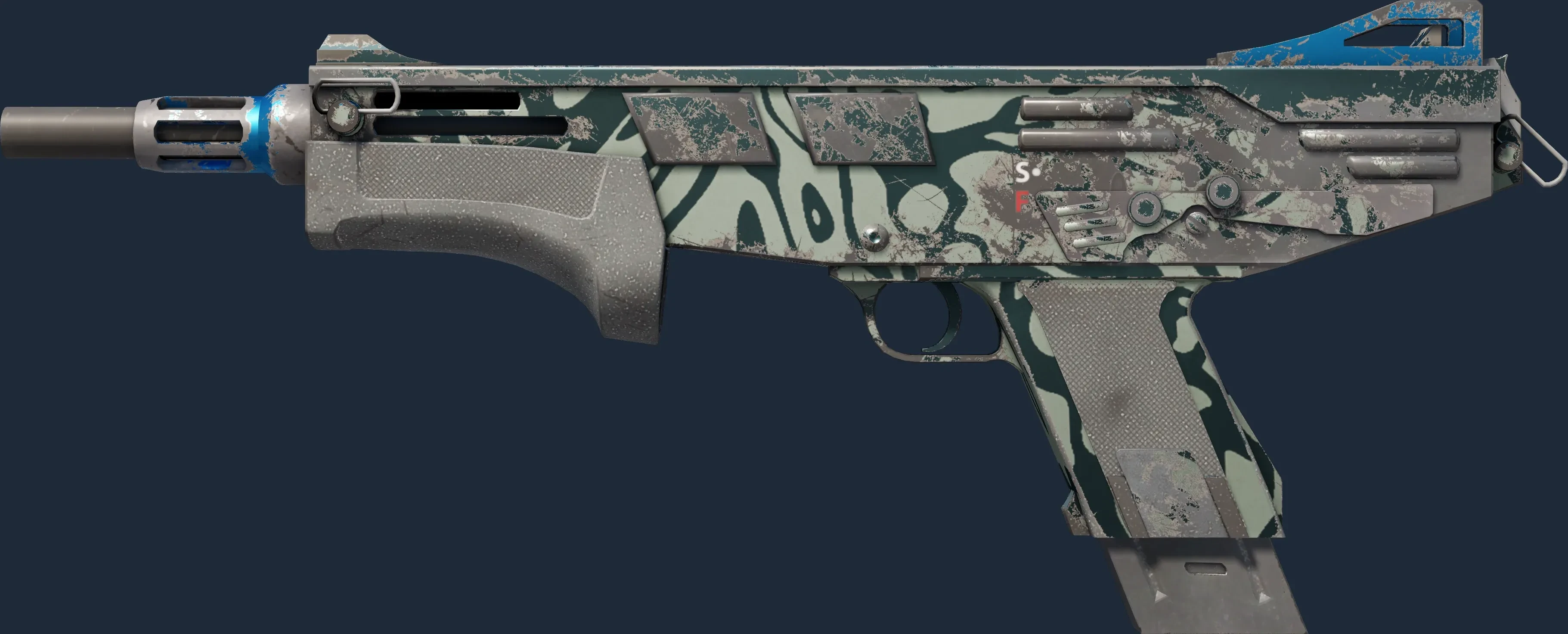 This MAG-7 has been painted in a "Anodized Multicolored" style, with the Hard Water finish. In this style, the candy coat may be applied in a multicolored pattern. In the real world, methods could include silk-screening or adherable stencils. The skin has been painted in a color scheme of blue and cyan. The look of the Hard Water finish is affected by its pattern index. The skin uses the old legacy model.