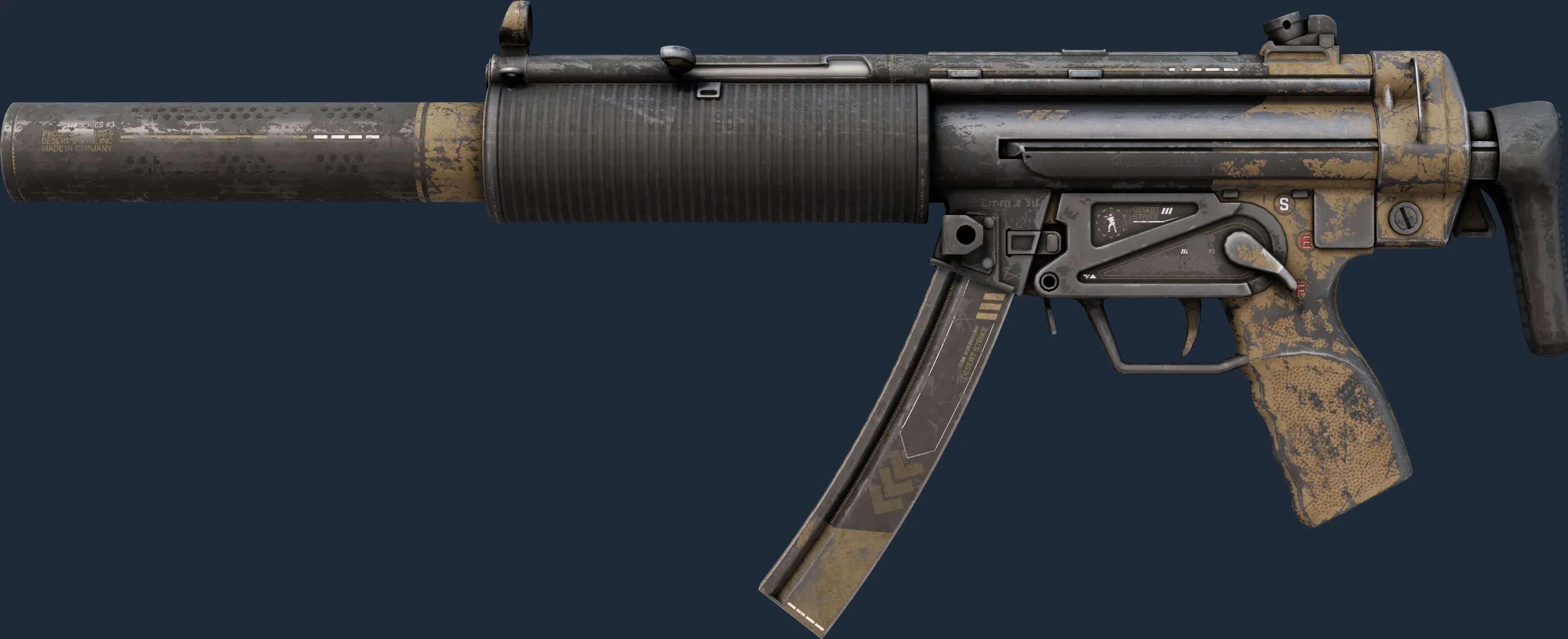 The MP5-SD | Desert Strike is a Covert grade skin for the MP5-SD in Counter-Strike 2. It features a Custom Paint Job finish and was designed by Nextgenz.