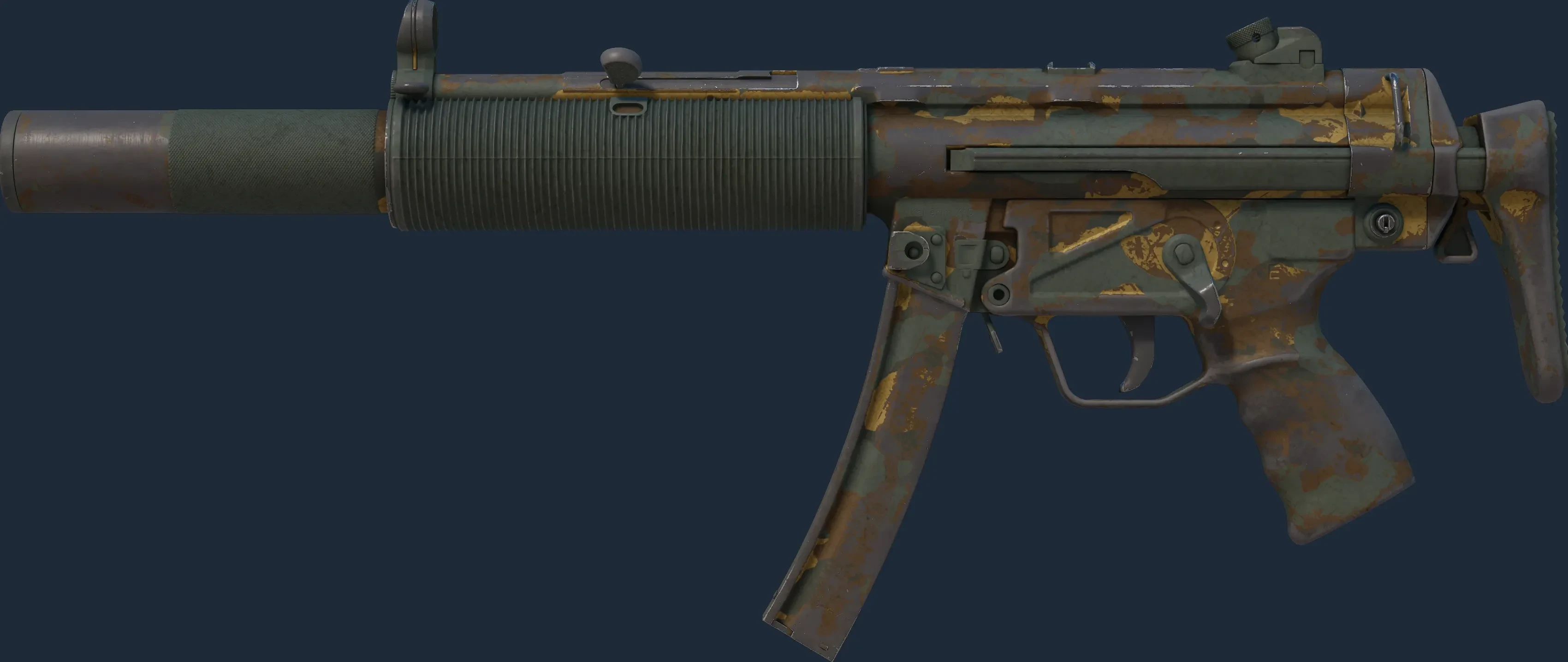 The MP5-SD | Gold Leaf is a Covert grade skin for the MP5-SD in Counter-Strike 2. It features a Custom Paint Job finish and was designed by Valve.