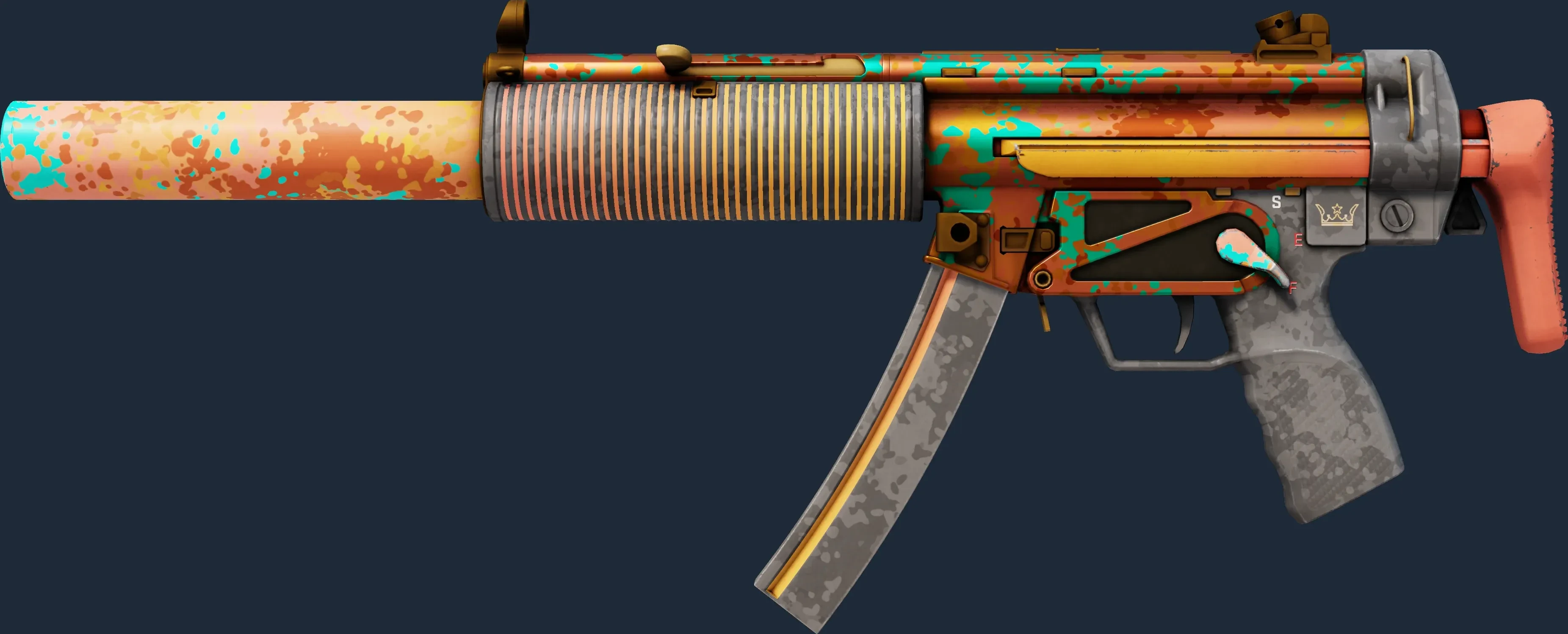 The MP5-SD | Oxide Oasis is a Covert grade skin for the MP5-SD in Counter-Strike 2. It features a Custom Paint Job finish and was designed by Valve.