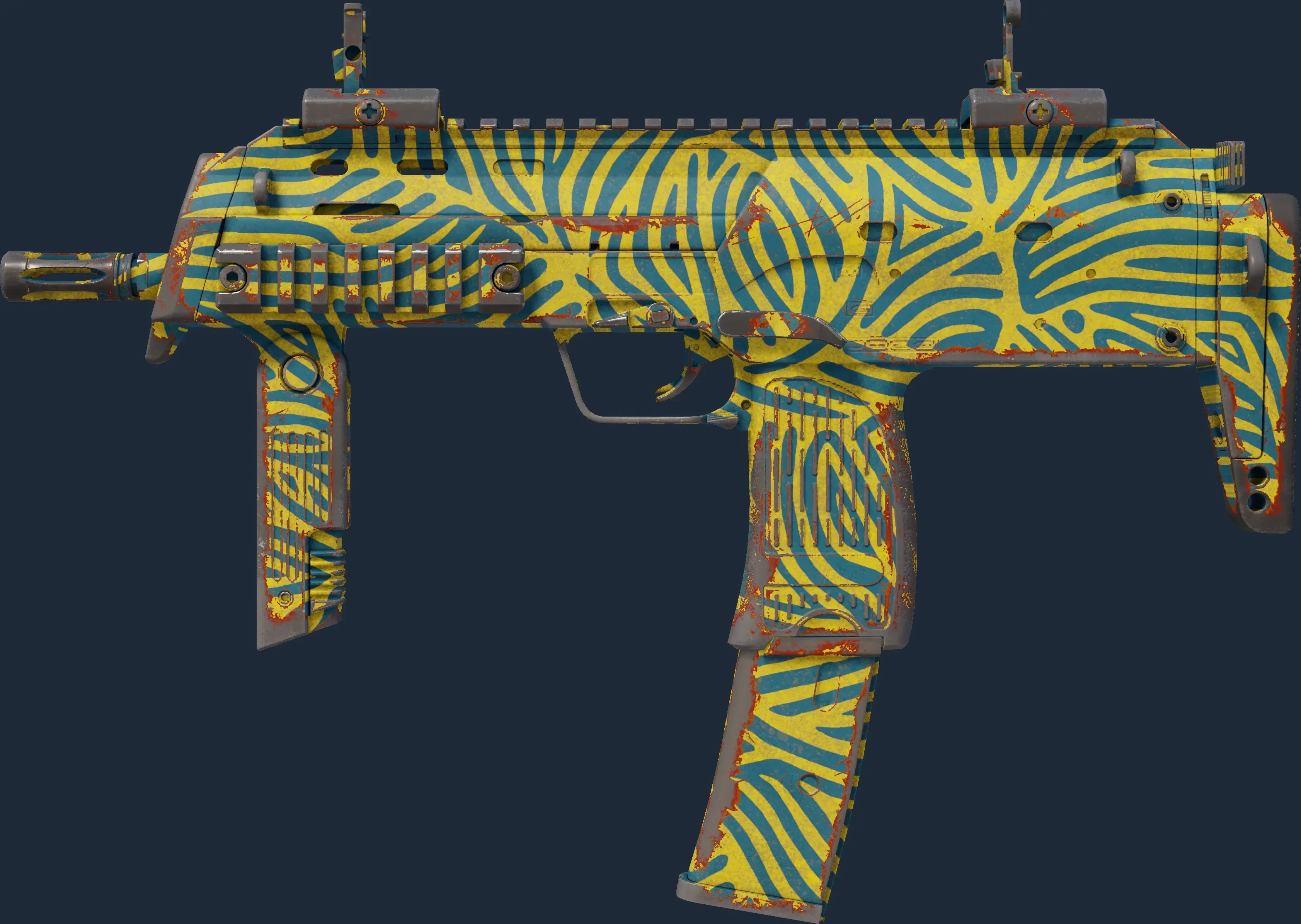 This MP7 has been painted in a "Spray-Paint" style, with the Akoben finish. The weapon is spray-painted with multiple coats through stencil patterns. The skin has been painted in a color scheme of yellow and blue. The look of the Akoben finish is affected by its pattern index. The skin uses the new CS2 model.