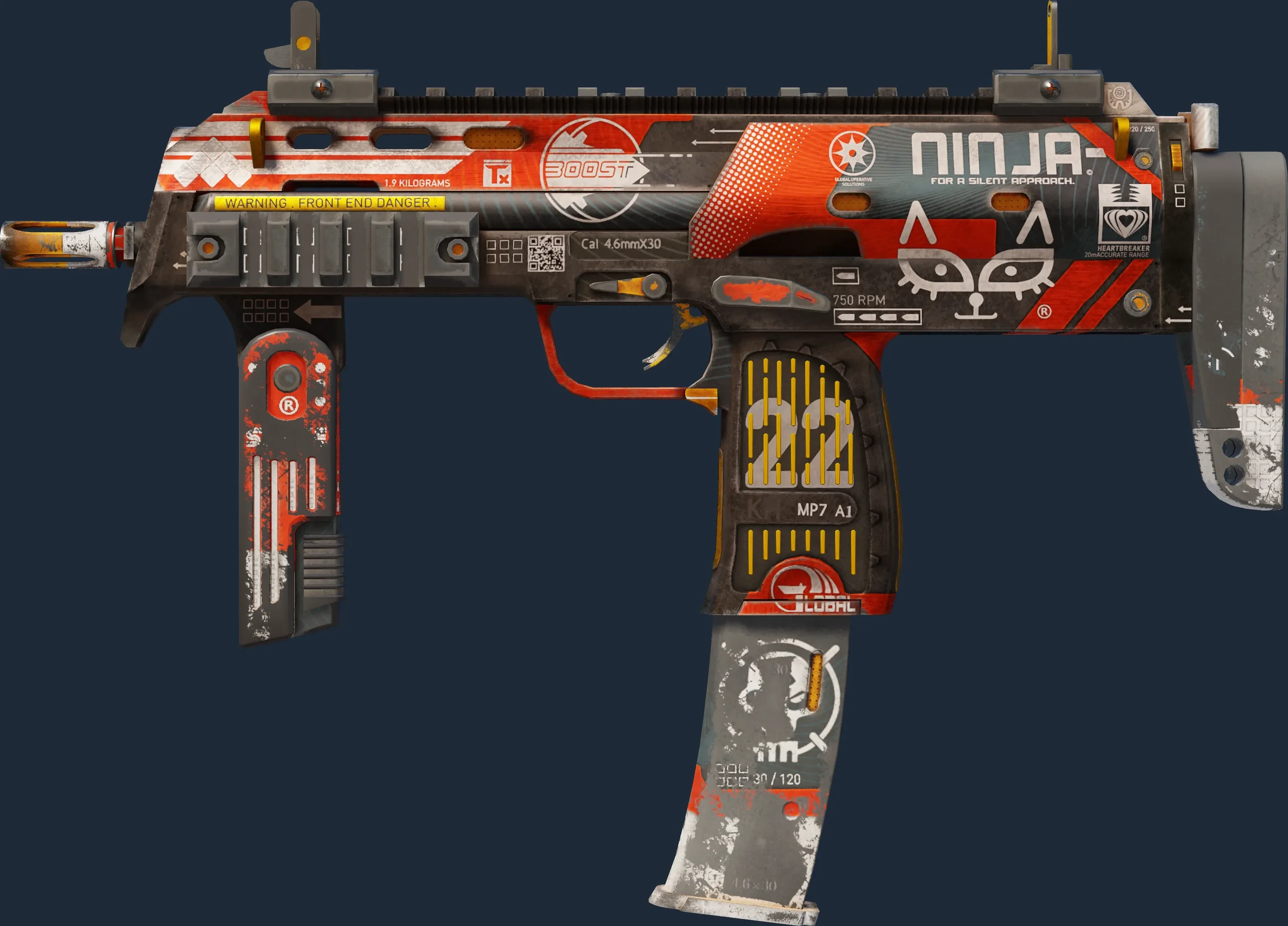 Versatile but expensive, the German-made MP7 SMG is the perfect choice for high-impact close-range combat. It has been covered in white logo decals over a red and black hydrographic. _Space for rent_
