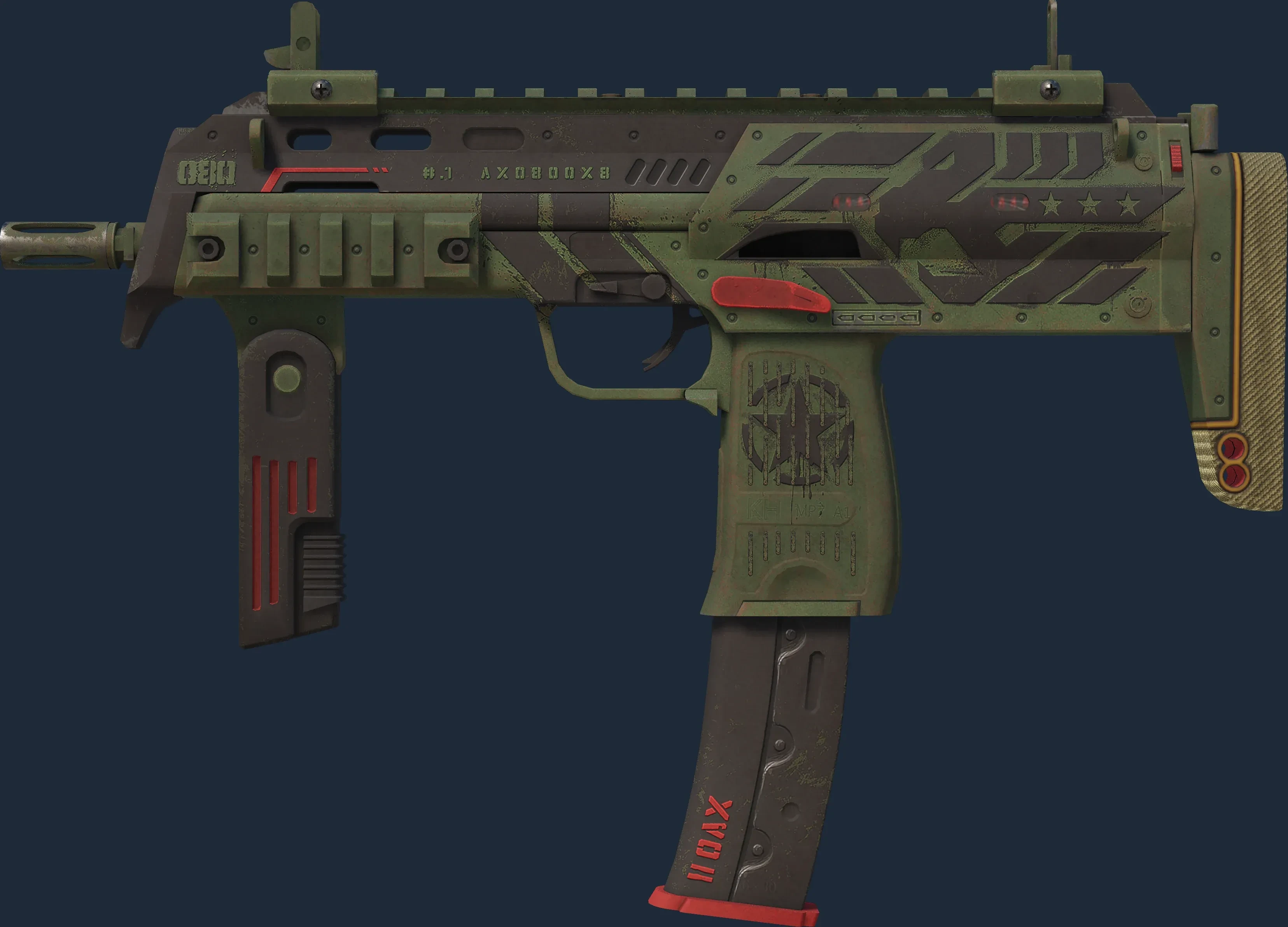 The Guerrilla has a float value range from 0.00 to 1.00, making it available in 5 wear conditions: Factory New, Minimal Wear, Field-Tested, Well-Worn, Battle-Scarred.