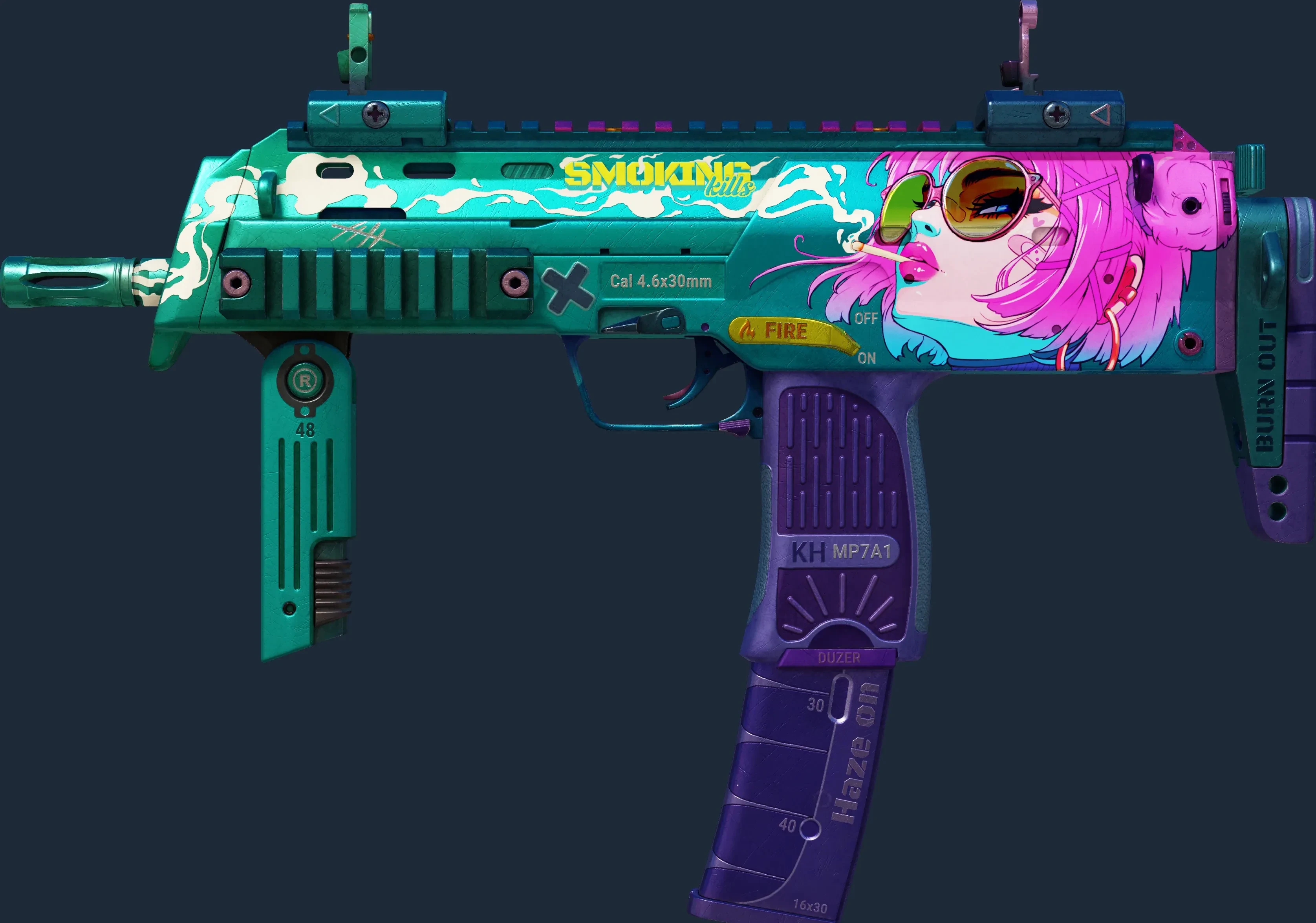 The MP7 | Smoking Kills is a Covert grade skin for the MP7 in Counter-Strike 2. It features a Custom Paint Job finish and was designed by 48.