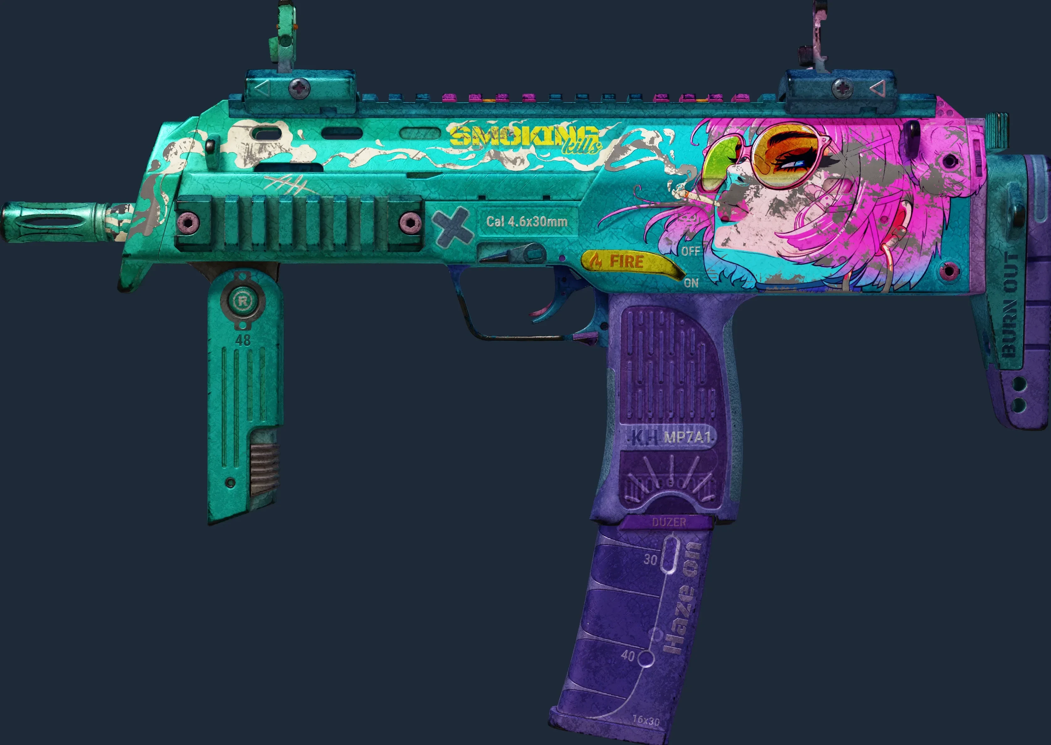 The MP7 | Smoking Kills is a Covert grade skin for the MP7 in Counter-Strike 2. It features a Custom Paint Job finish and was designed by 48.