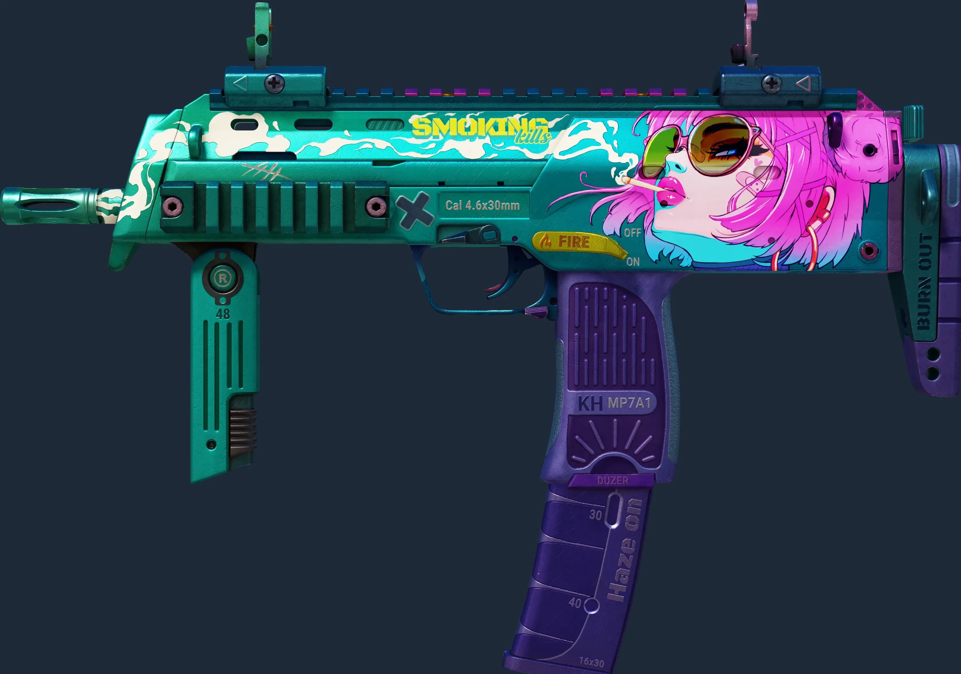 The MP7 | Smoking Kills is a Covert grade skin for the MP7 in Counter-Strike 2. It features a Custom Paint Job finish and was designed by 48.