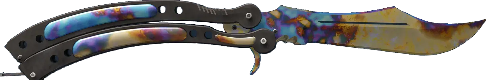 This is a custom-designed balisong, commonly known as a knives/butterfly-knife" class="text-orange-500 hover:underline underline-offset-4 decoration-orange-500/30">butterfly knife. The defining characteristic of this weapon is the fan-like opening of a freely pivoting blade, allowing rapid deployment or concealment. As a result, butterfly knives are outlawed in many countries. It has been color case-hardened through the application of wood charcoal at high temperatures. _A little color never hurt anyone_