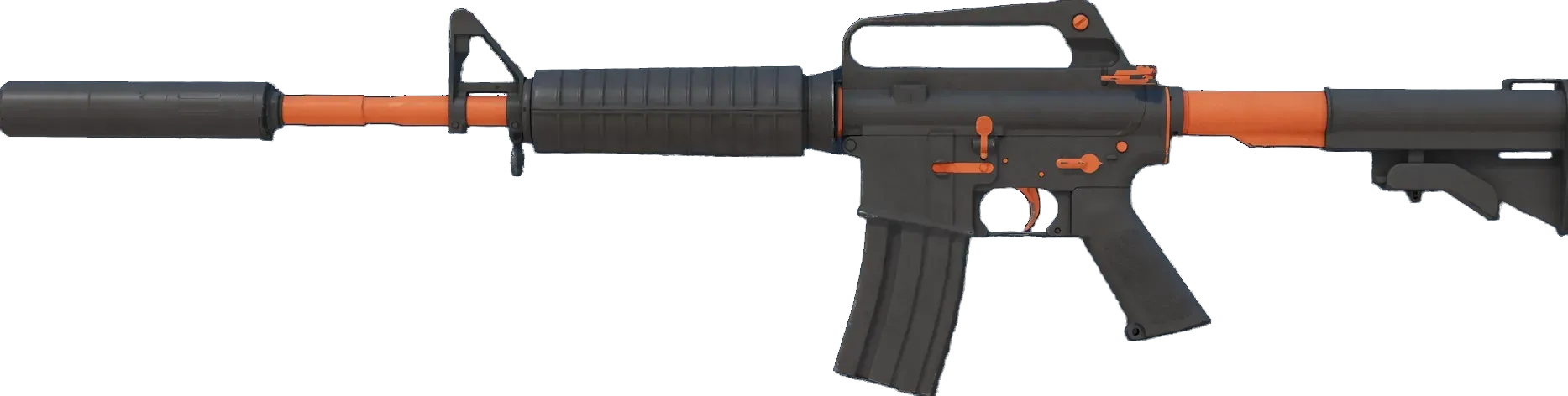 With a smaller magazine than its unmuffled counterpart, the silenced M4A1 provides quieter shots with less recoil and better accuracy. It has individual parts spray-painted black and tangerine orange. _Rona is as good as she thinks she is... she's just not old enough to realize she shouldn't point it out to everyone - Felix Riley, Commanding Officer_