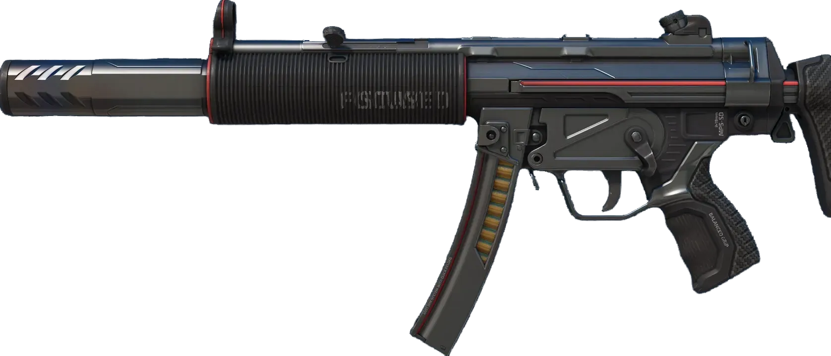 Often imitated but never equaled, the iconic MP5 is perhaps the most versatile and popular SMG in the world. This SD variant features an integrated silencer, making an already formidable weapon whisper-quiet. It has been custom painted in gunmetal grey and finished with red accents. _STAY FOCUSED // TRUE AIM_