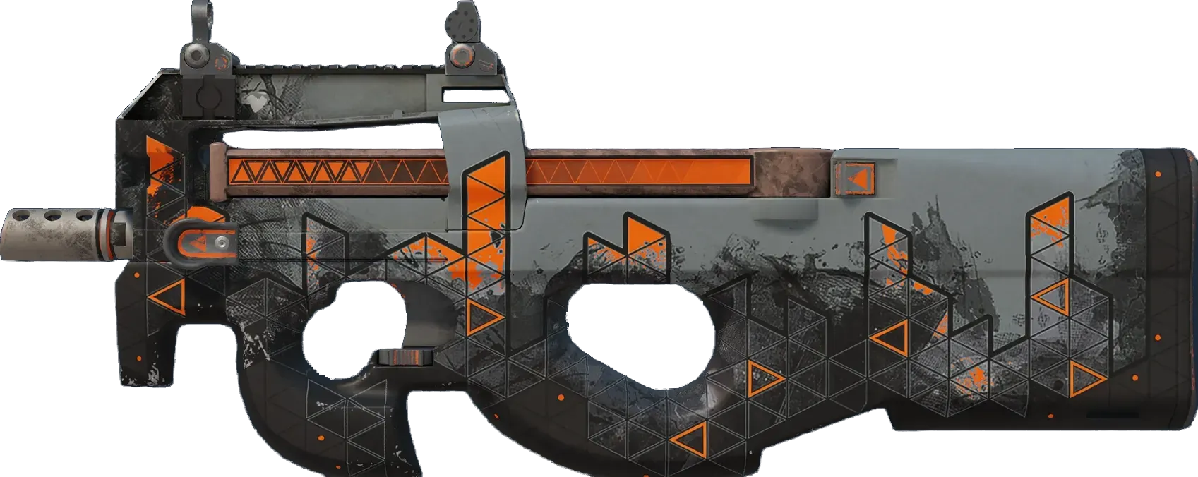 Easily recognizable for its unique bullpup design, the P90 is a great weapon to shoot on the move due to its high-capacity magazine and low recoil. It has been custom painted in contrasting orange, grey and black. _Become a human typhoon_