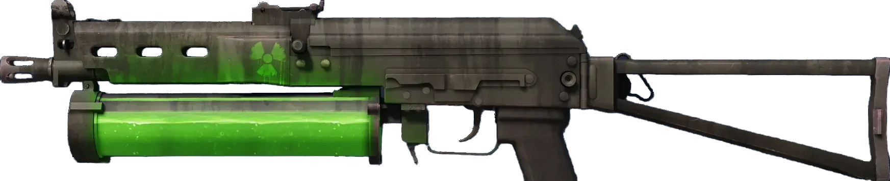 The Bizon SMG is low-damage, but offers a uniquely designed high-capacity drum magazine that reloads quickly. It has been custom painted to give the illusion of irradiated ammo. _Sometimes grunts have the upper hand_