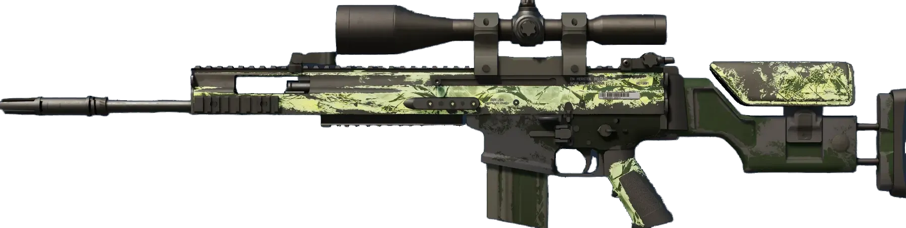 The SCAR-20 is a semi-automatic sniper rifle that trades a high rate of fire and powerful long-distance damage for sluggish movement speed and big price tag. It has been painted with vibrant shades of green. _Valeria is getting bolder... the time has come to take the fight to her - Felix Riley, Commanding Officer_