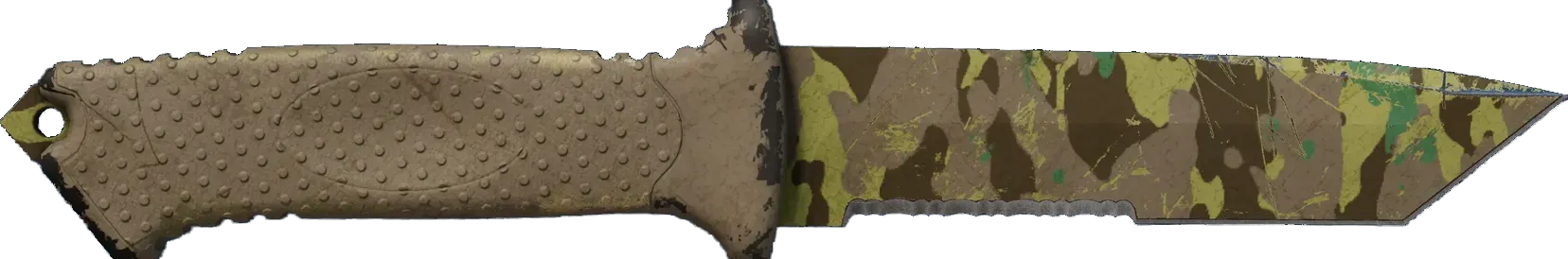 This tanto-style survival knife features a faceted blade and full tang, complete with impact pommel. No fuss, no moving parts - just a reliable blade that's ready to work. It has been painted using a forest camouflage hydrographic. _The woods can be a dangerous place... never travel alone_