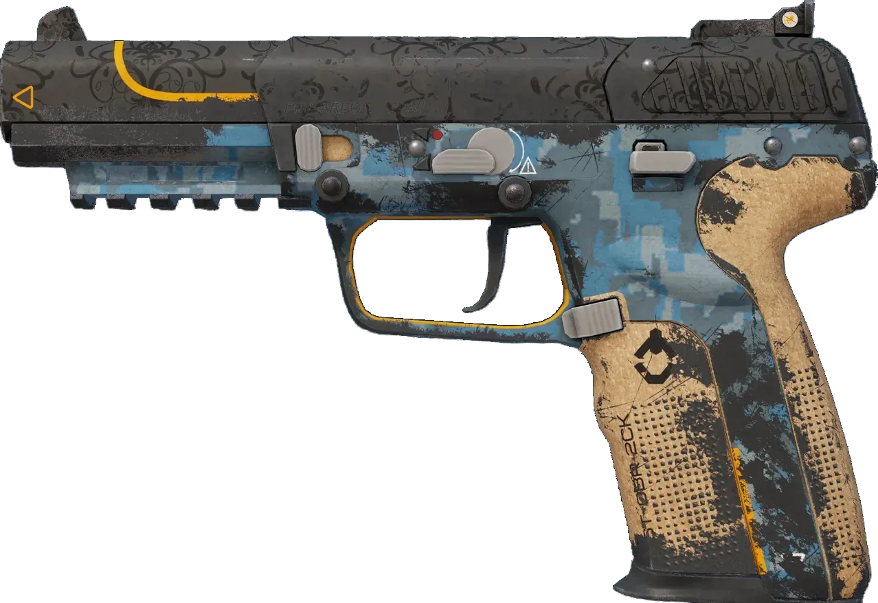 Highly accurate and armor-piercing, the pricy Five-Seven is a slow-loader that compensates with a generous 20-round magazine and forgiving recoil. It has been given a light blue DDPAT hydrographic as well as a custom painted slide. _I don't profit from war, I profit from the human condition... - Booth, Arms Dealer_
