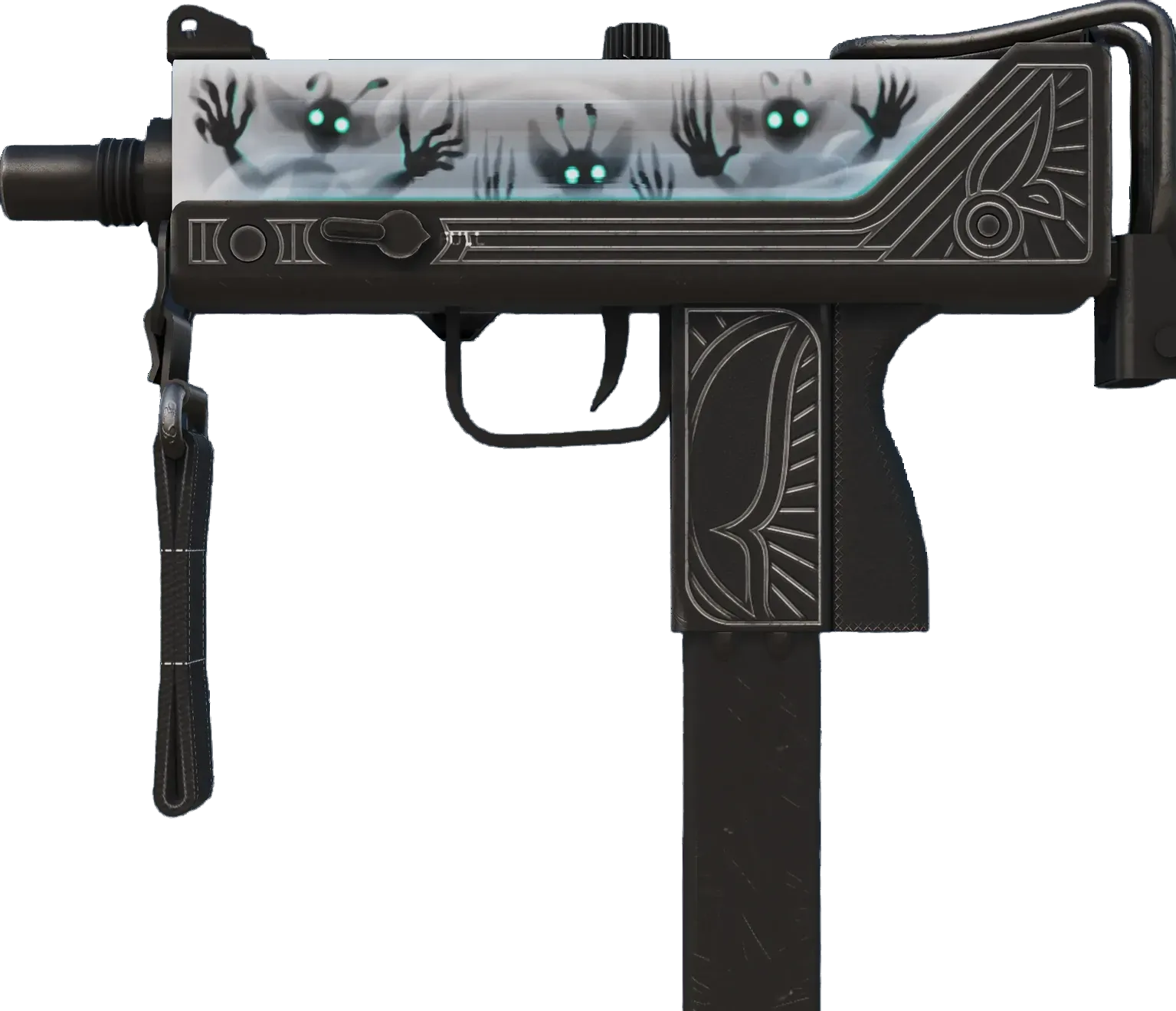 Essentially a box that bullets come out of, the MAC-10 SMG boasts a high rate of fire, with poor spread accuracy and high recoil as trade-offs. A custom paint job of pixies, trapped inside the weapon and eager to escape, has been applied. _They have yet to find someone they cannot fool_