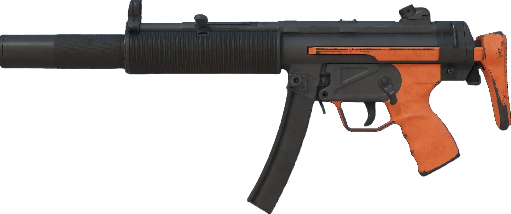 Often imitated but never equaled, the iconic MP5 is perhaps the most versatile and popular SMG in the world. This SD variant features an integrated silencer, making an already formidable weapon whisper-quiet. It has individual parts spray-painted black and tangerine orange. _Rona is as good as she thinks she is... she's just not old enough to realize she shouldn't point it out to everyone - Felix Riley, Commanding Officer_