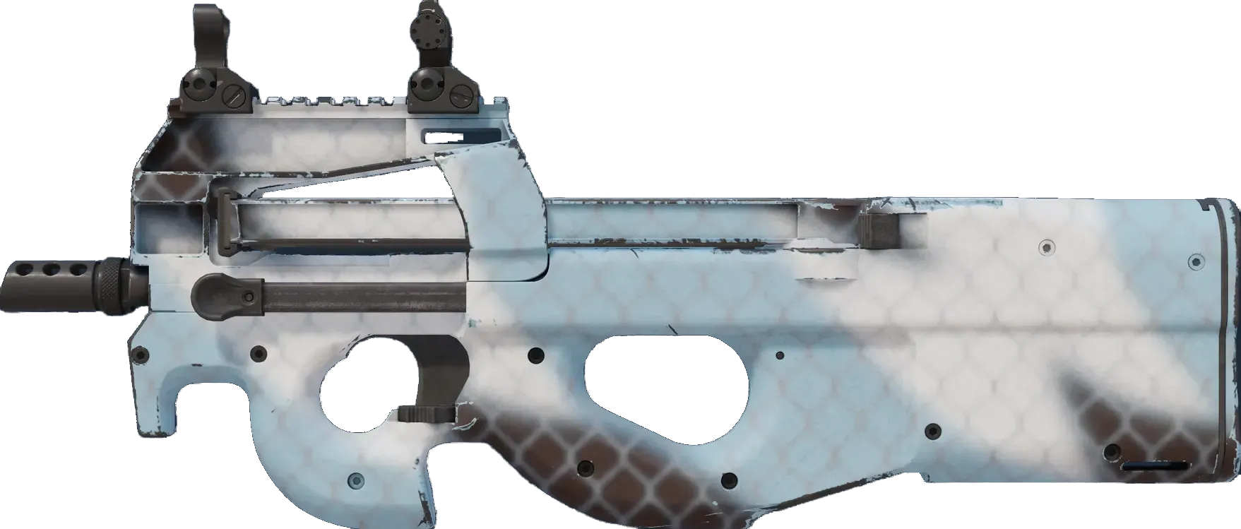 Float-verdien til P90 | Glacier Mesh varierer fra 0.00 til 1.00, noe som gjør skinnet tilgjengelig i alle eksteriører. For hvert eksteriør finnes det også en StatTrak-versjon for Glacier Mesh.