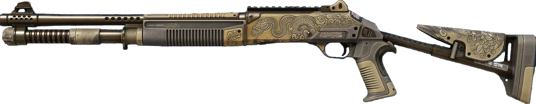 The XM1014 is a powerful fully automatic shotgun that justifies its heftier price tag with the ability to paint a room with lead fast. A snake has been custom painted atop a gold-colored base in a style inspired by the Japanese tattoo art style Irezumi. _Snakes represent wisdom and prophecy, two words which best describe XM1014 users_