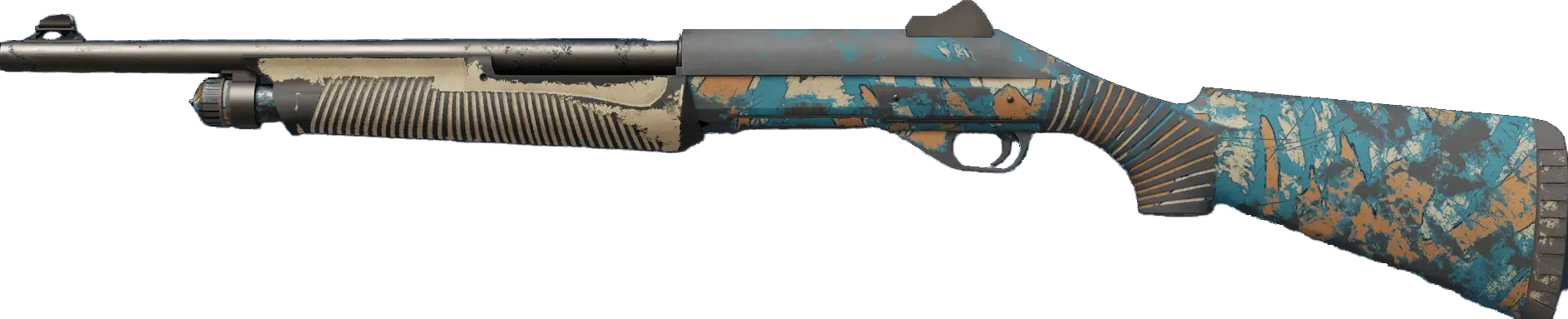 The Nova's rock-bottom price tag makes it a great ambush weapon for a cash-strapped team. A tan and blue hydrographic pattern has been applied to the stock and receiver. The barrel has been painted dark blue. _"A welcome sight" would be putting it lightly_