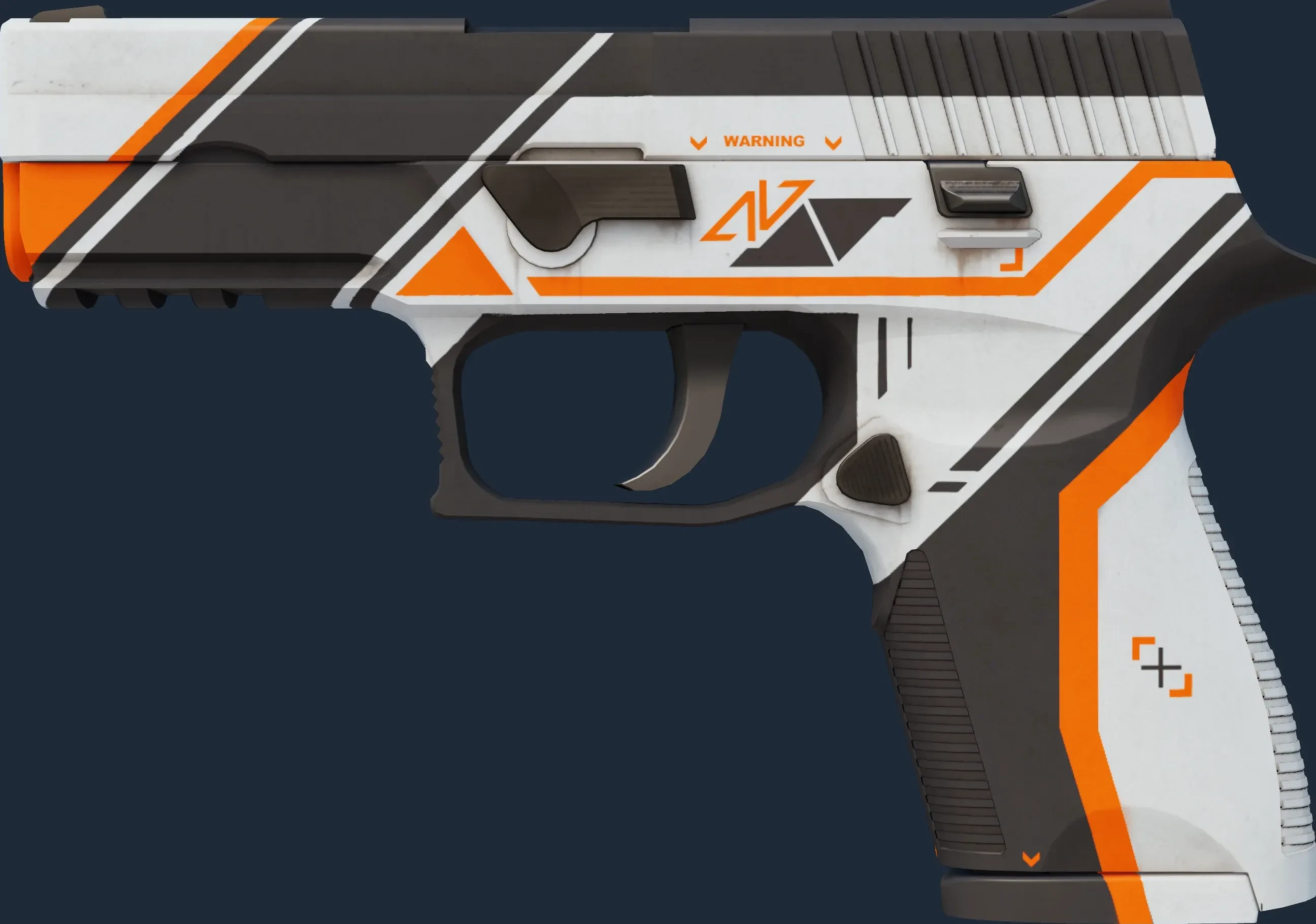 This P250 has been painted in a "Custom Paint Job" style, with the Asiimov finish. This style enables extremely customized looks in a full range of colors. The skin has been painted in a color scheme of orange and white. Different pattern indexes have no effect on the Asiimov finish. The skin uses the old legacy model.
