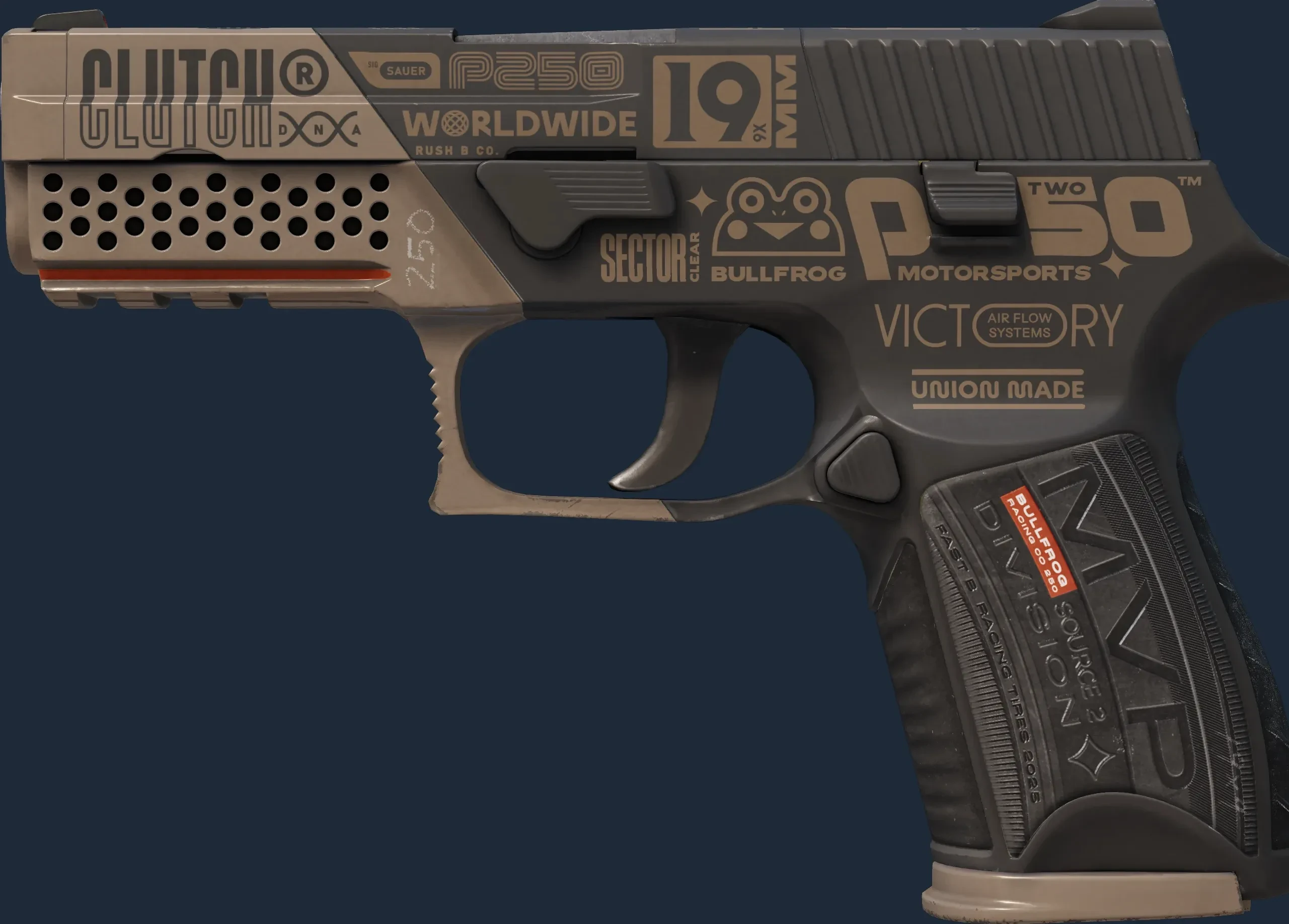 The P250 | Bullfrog is a Covert grade skin for the P250 in Counter-Strike 2. It features a Custom Paint Job finish and was designed by Flick Montana.