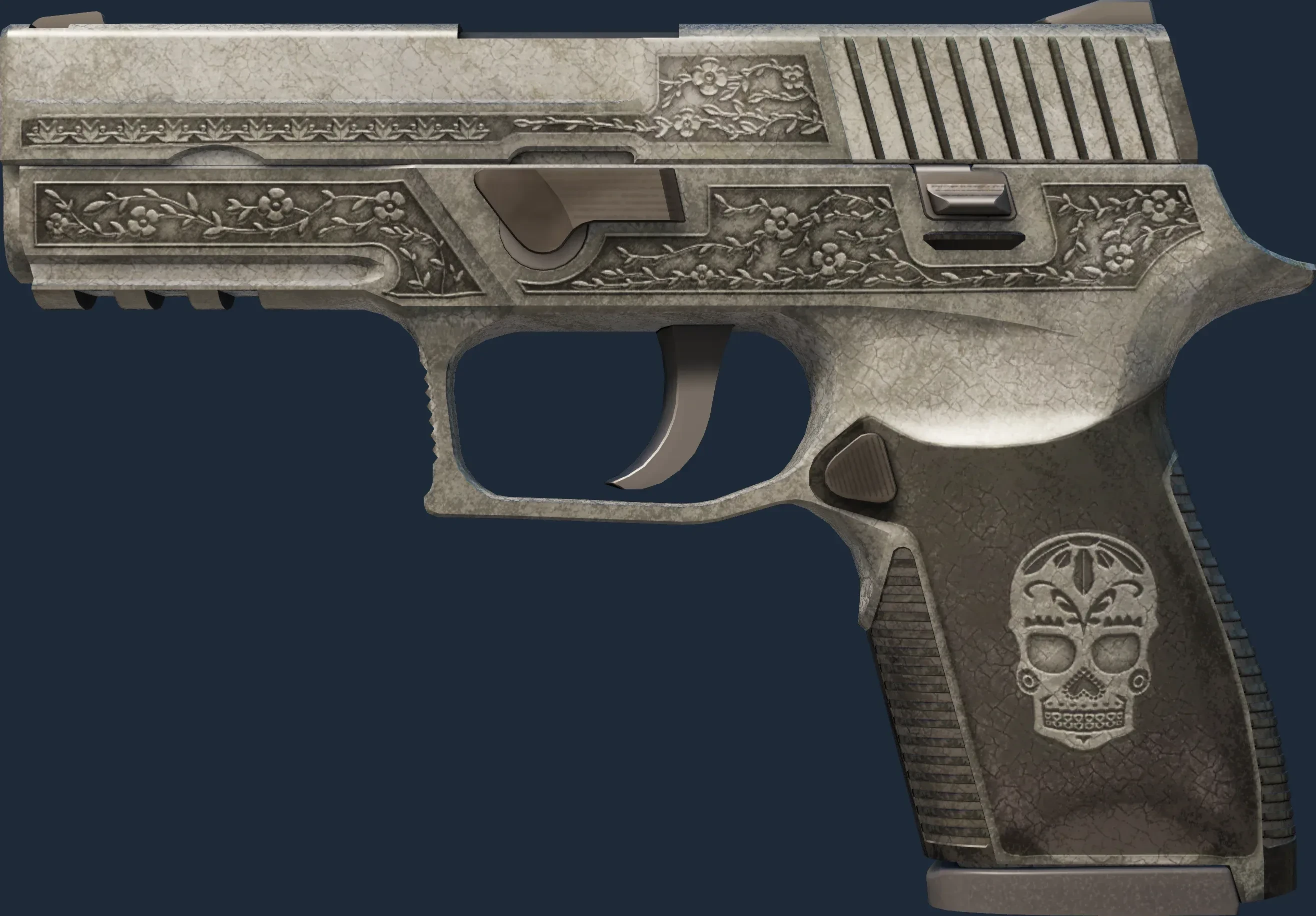 A low-recoil firearm with a high rate of fire, the P250 is a relatively inexpensive choice against armored opponents. It has been engraved with skeletons, flowers and serpents. _One little squeeze turns every morning into the Day of the Dead_