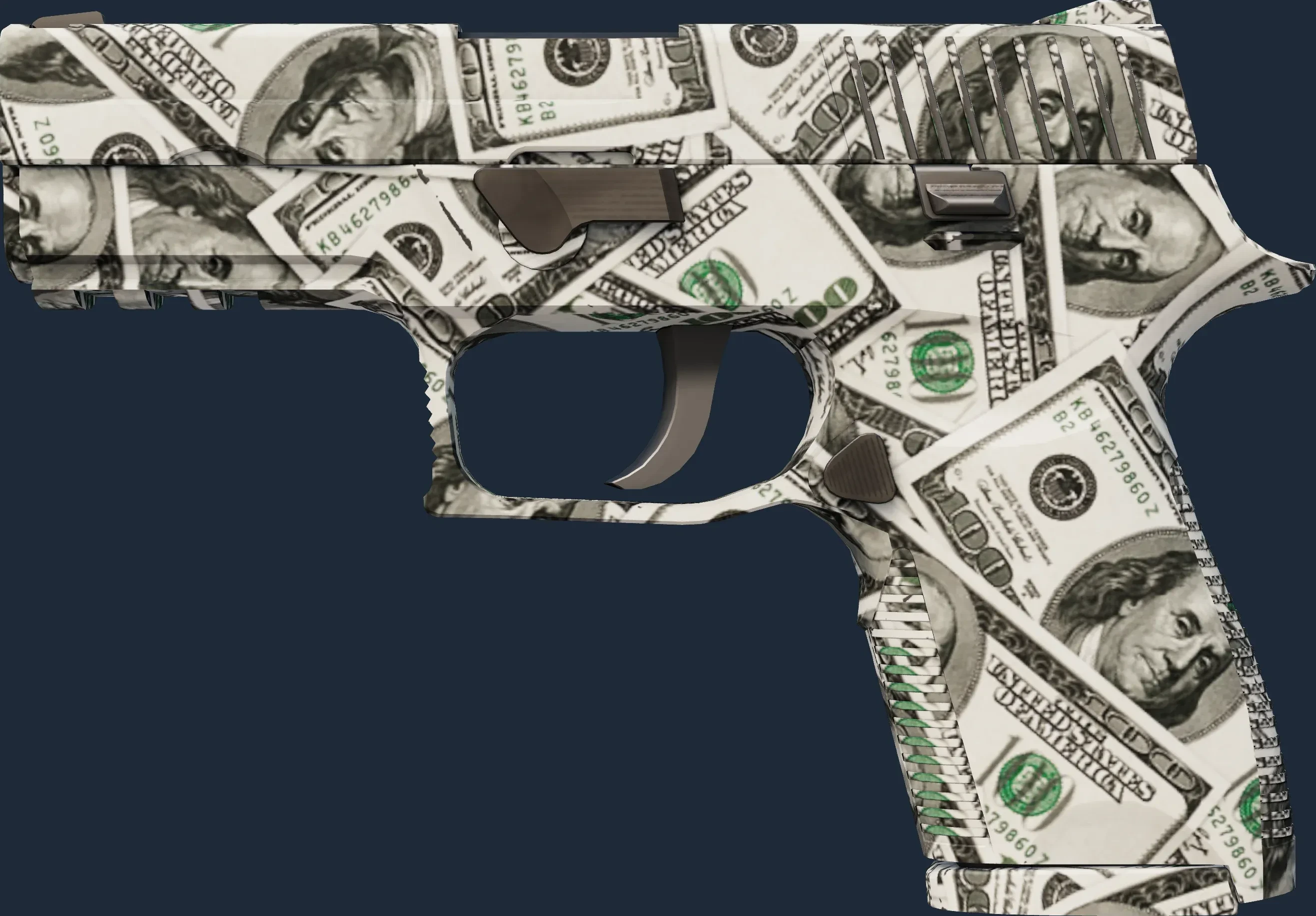 The P250 | Franklin is a Covert grade skin for the P250 in Counter-Strike 2. It features a Custom Paint Job finish and was designed by Valve.