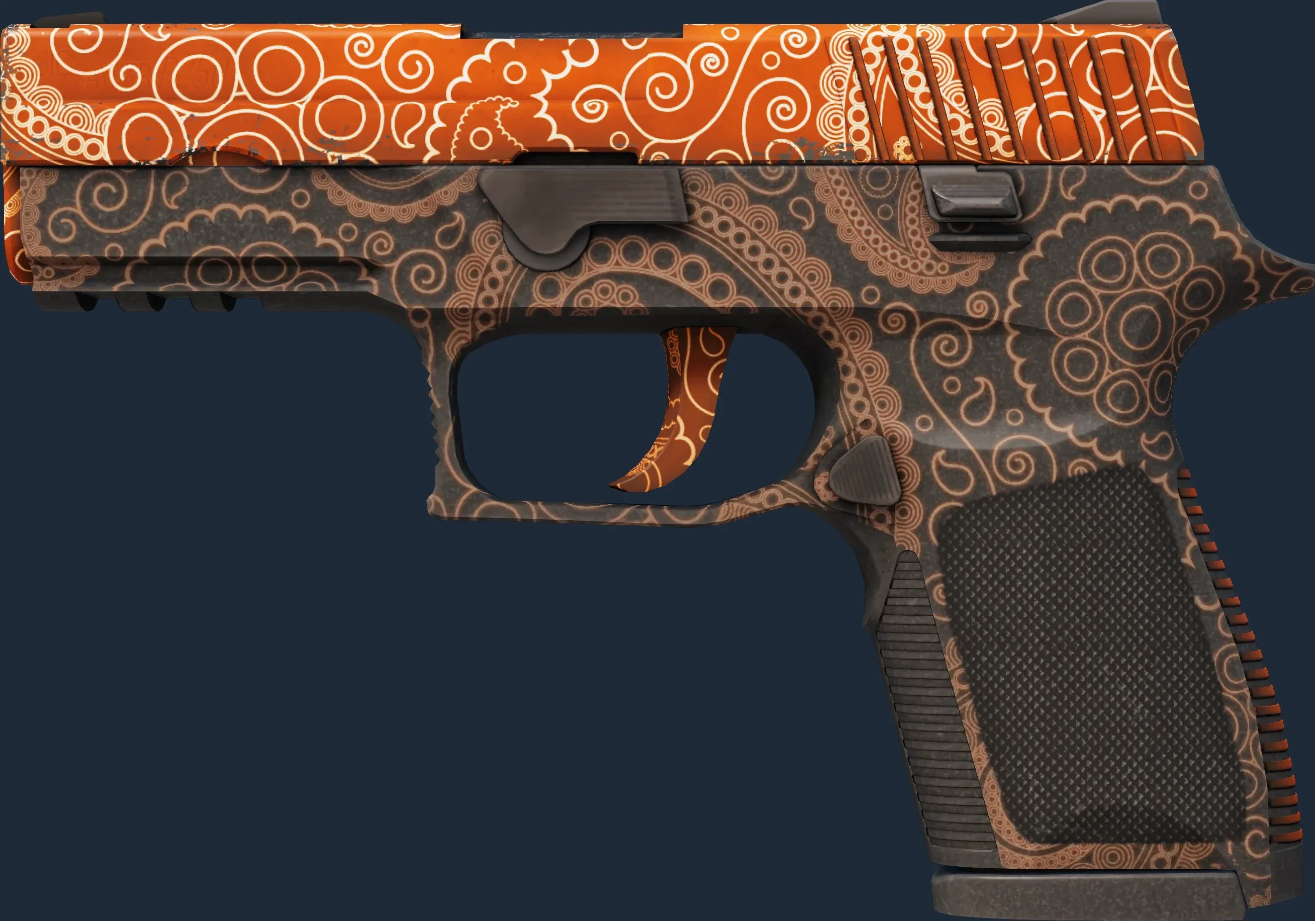 This P250 has been painted in a "Custom Paint Job" style, with the Mehndi finish. This style enables extremely customized looks in a full range of colors. Different pattern indexes have no effect on the Mehndi finish. The skin uses the old legacy model.