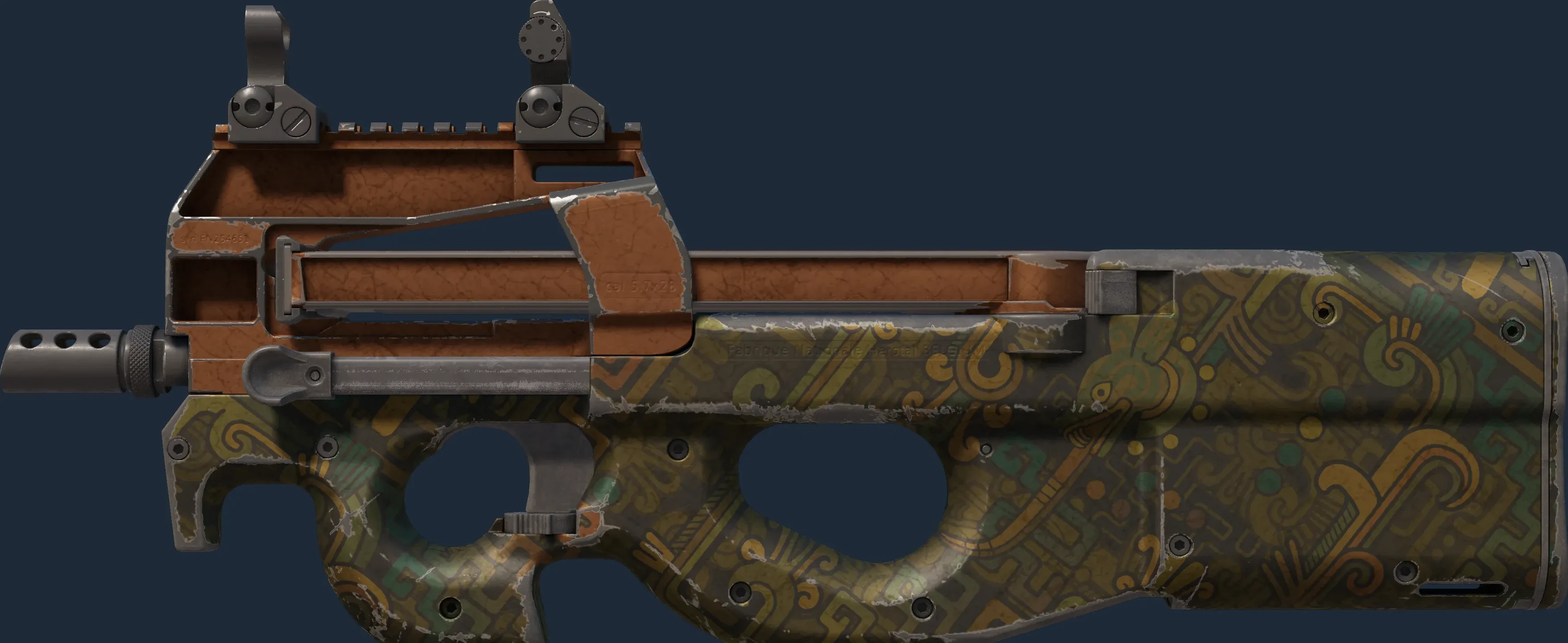 The P90 | Ancient Earth is a Covert grade skin for the P90 in Counter-Strike 2. It features a Custom Paint Job finish and was designed by Valve.
