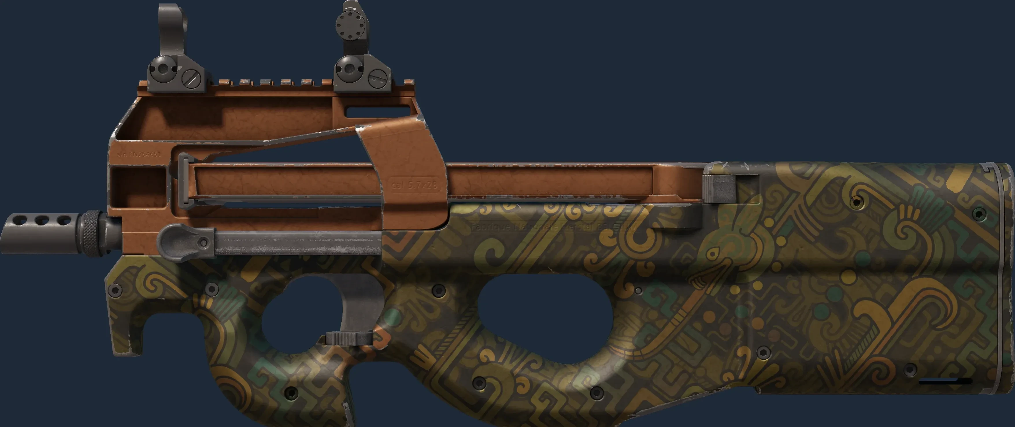 The P90 | Ancient Earth is a Covert grade skin for the P90 in Counter-Strike 2. It features a Custom Paint Job finish and was designed by Valve.