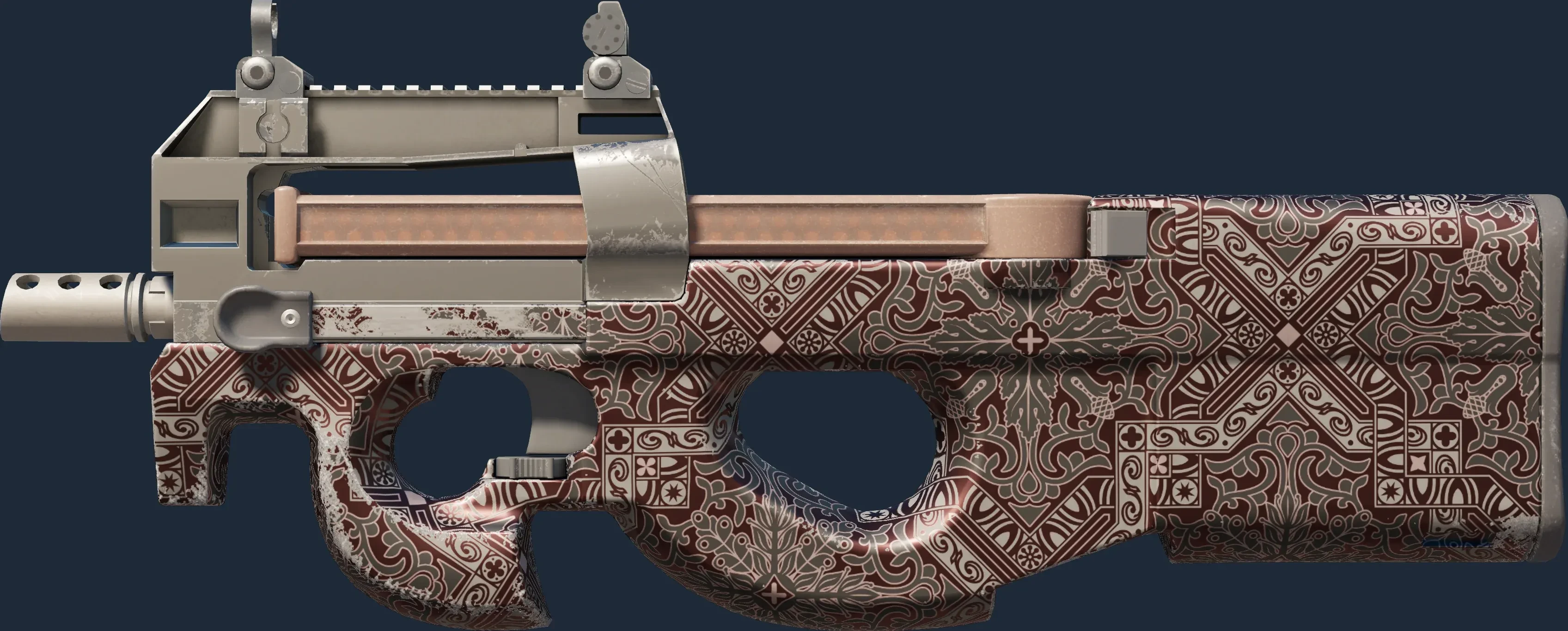 The P90 | Baroque Red is a Covert grade skin for the P90 in Counter-Strike 2. It features a Custom Paint Job finish and was designed by Valve.