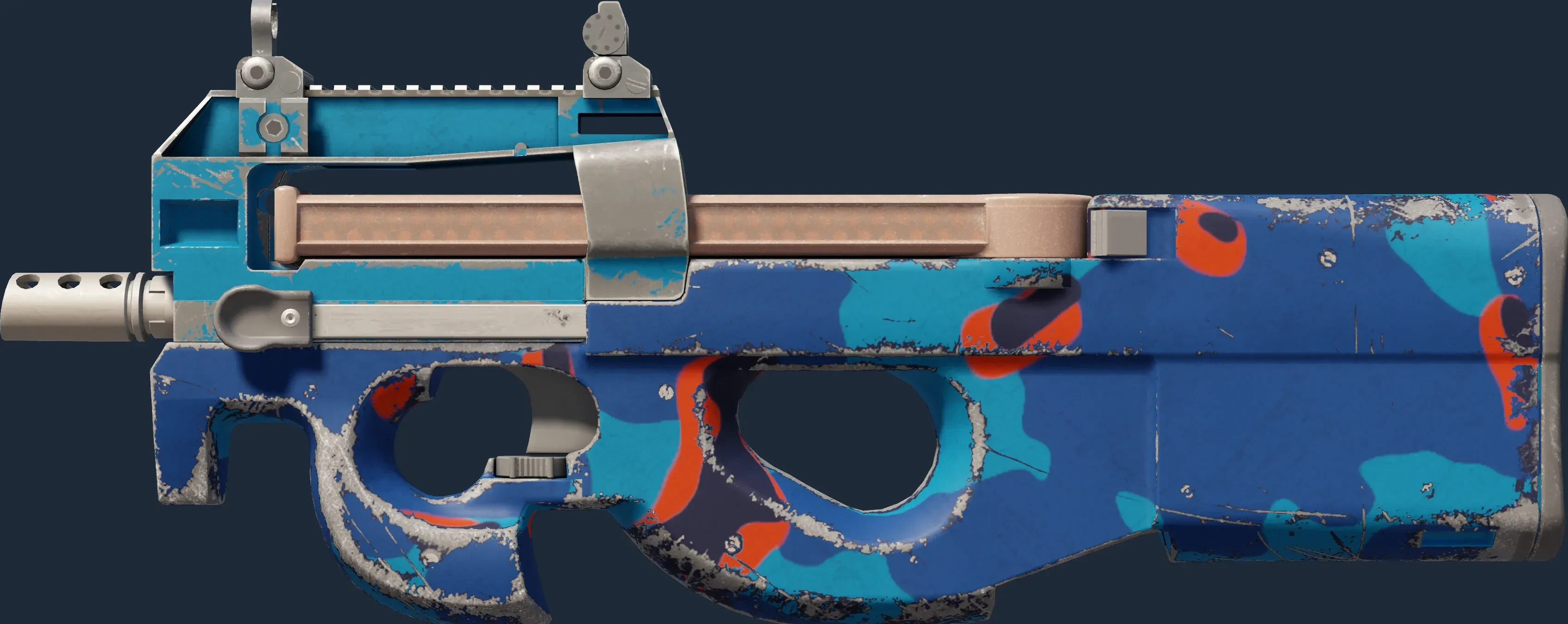 This P90 has been painted in a "Hydrographic" style, with the Blind Spot finish. Disassembled weapon parts are lowered through a floating hydrographic film on the surface of a water tank. The film adheres to the primed weapon parts, covering the surface with a pattern. The primary color of this skin is composed of a blue tint. The look of the Blind Spot finish is affected by its pattern index. The skin uses the old legacy model.