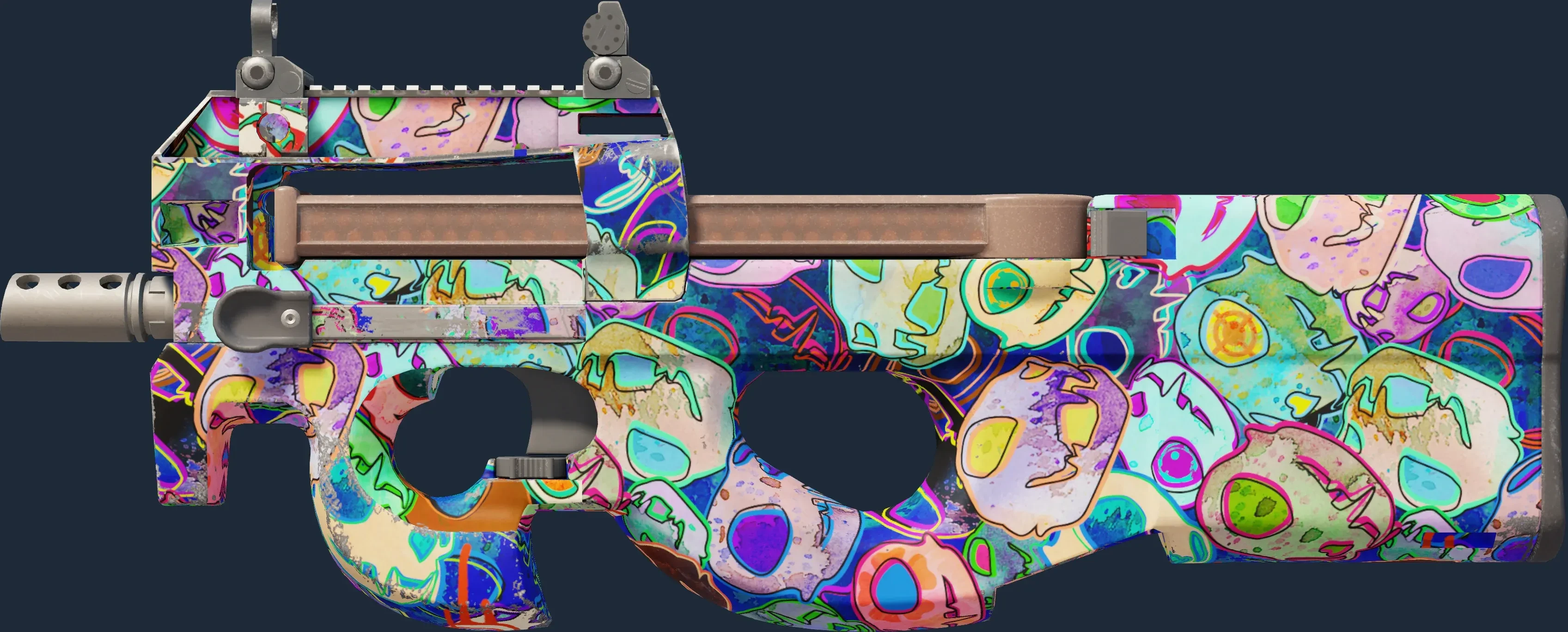 This P90 has been painted in a "Custom Paint Job" style, with the Death by Kitty finish. This style enables extremely customized looks in a full range of colors. The look of the Death by Kitty finish is affected by its pattern index. The skin uses the old legacy model.