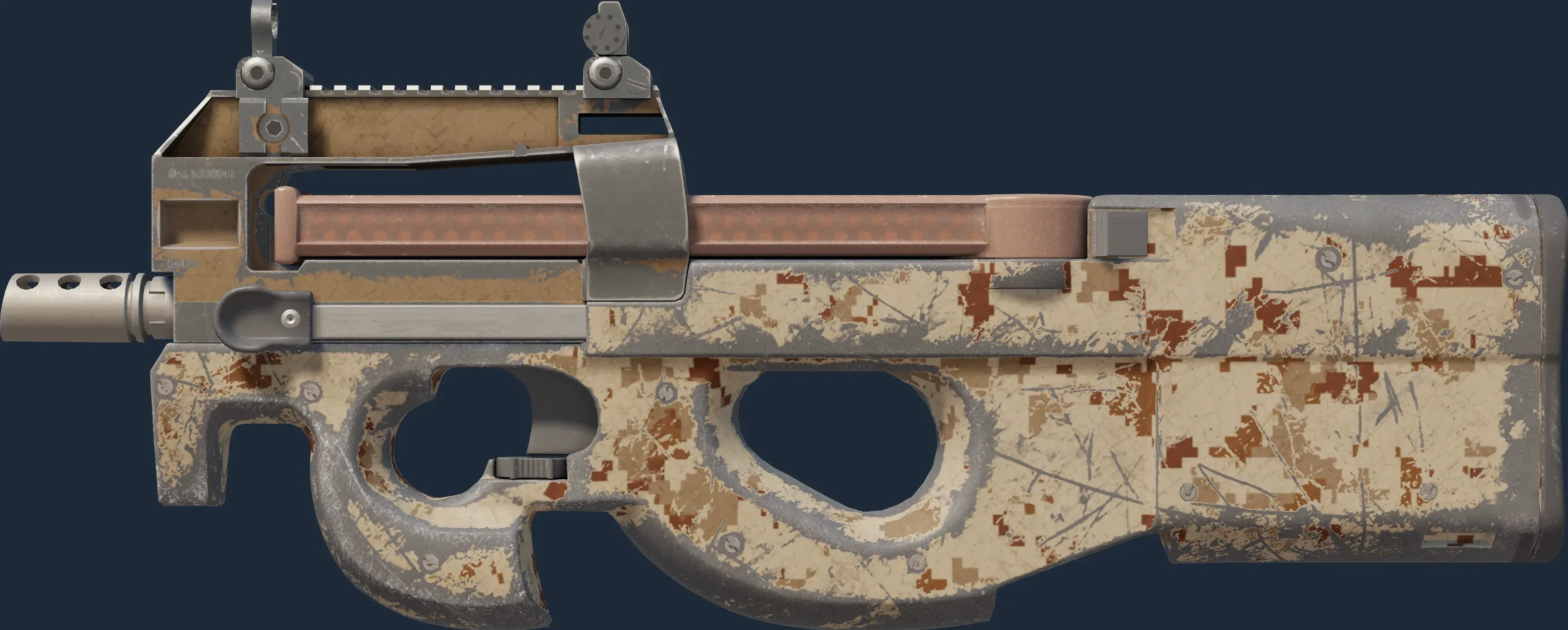 The P90 | Desert Ddpat is a Covert grade skin for the P90 in Counter-Strike 2. It features a Custom Paint Job finish and was designed by Valve.