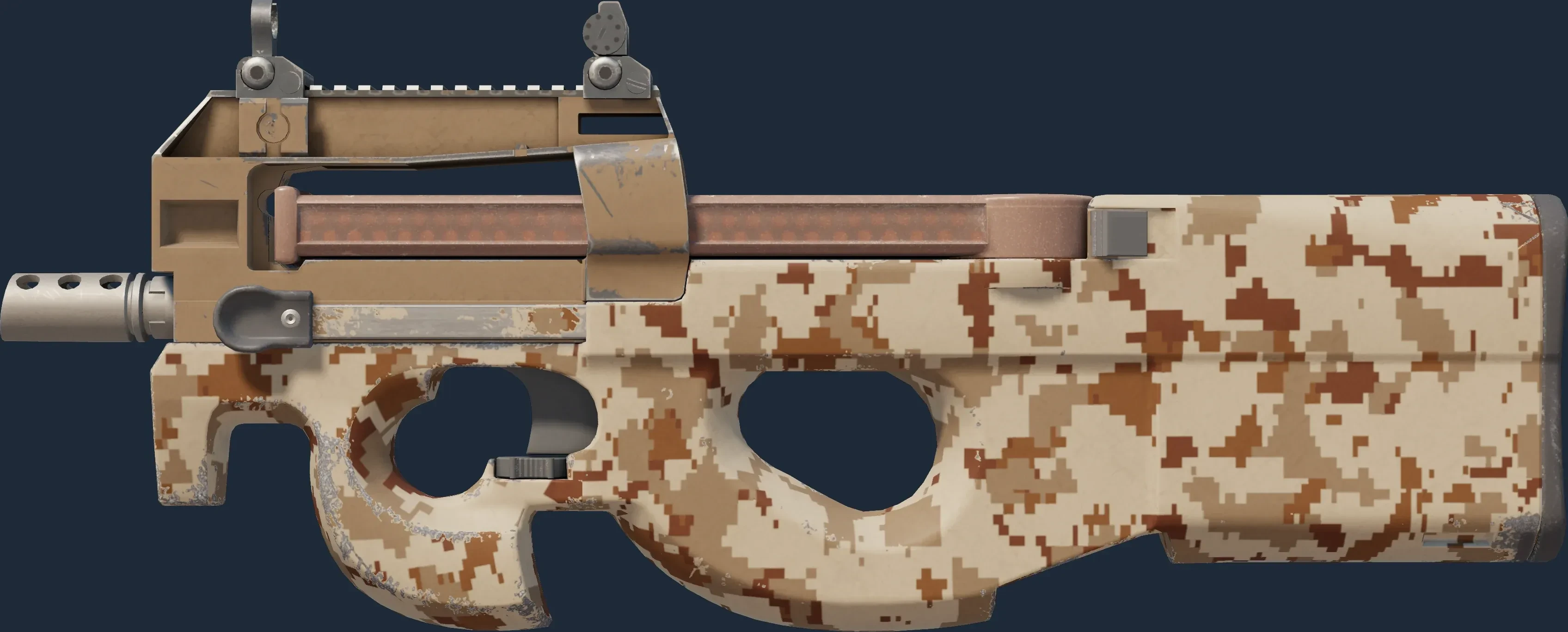 The P90 | Desert Ddpat is a Covert grade skin for the P90 in Counter-Strike 2. It features a Custom Paint Job finish and was designed by Valve.
