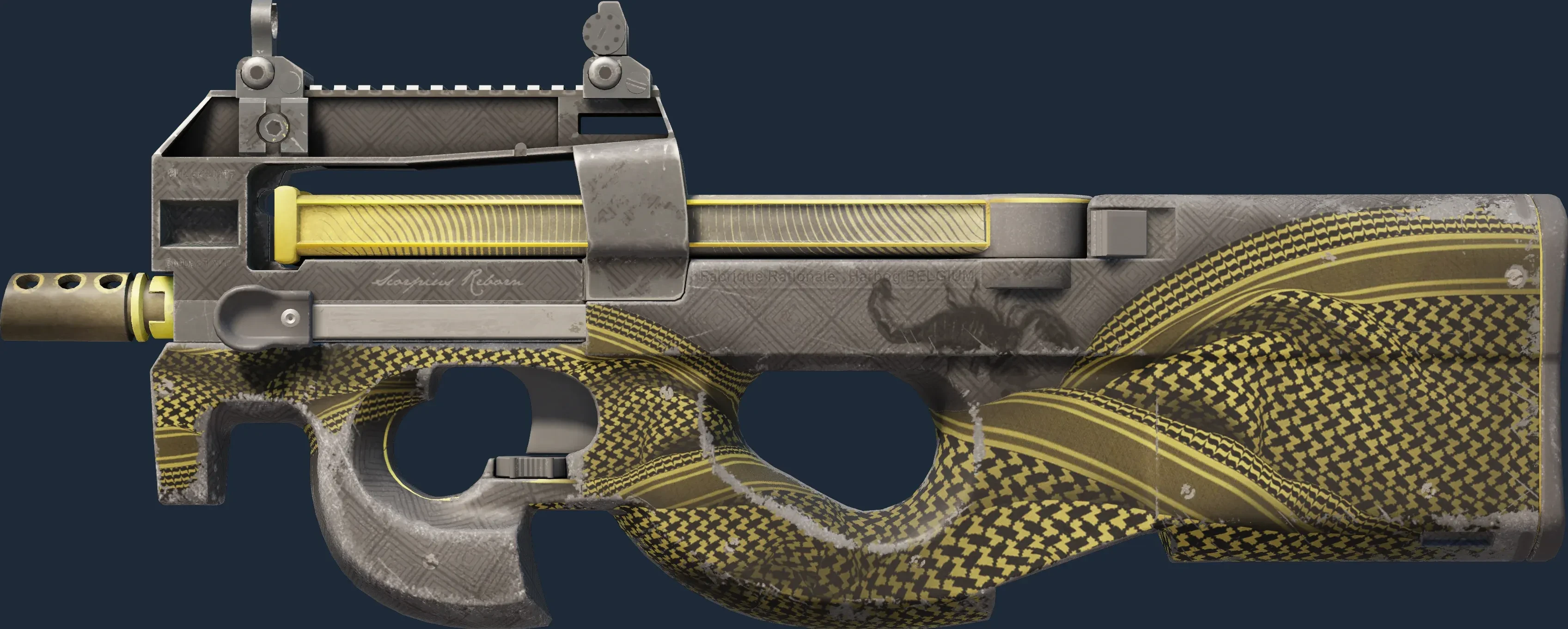 The P90 | Desert Warfare is a Covert grade skin for the P90 in Counter-Strike 2. It features a Custom Paint Job finish and was designed by sic.