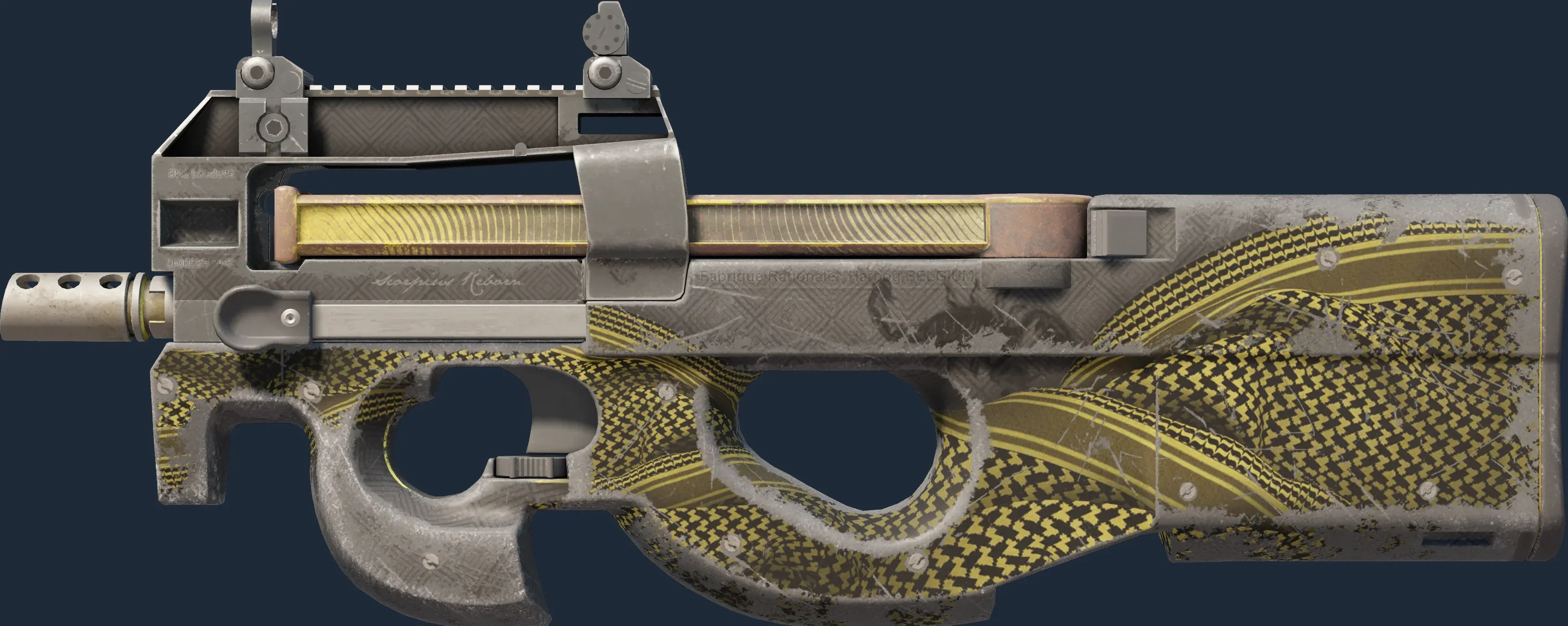 The P90 | Desert Warfare is a Covert grade skin for the P90 in Counter-Strike 2. It features a Custom Paint Job finish and was designed by sic.