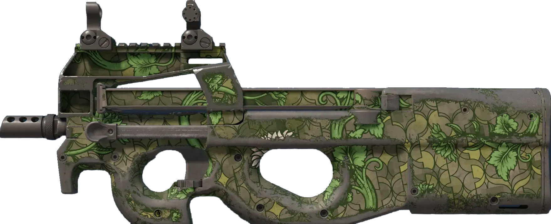 Easily recognizable for its unique bullpup design, the P90 is a great weapon to shoot on the move due to its high-capacity magazine and low recoil. It has been spray-painted with a flower pattern in various shades of green. _Some see a nuisance; I see beauty_