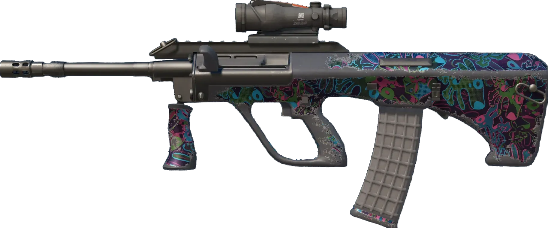 Powerful and accurate, the AUG scoped assault rifle compensates for its long reload times with low spread and a high rate of fire. A multicolored Pop Dog pattern has been applied. _Not to be confused with "ladder"_
