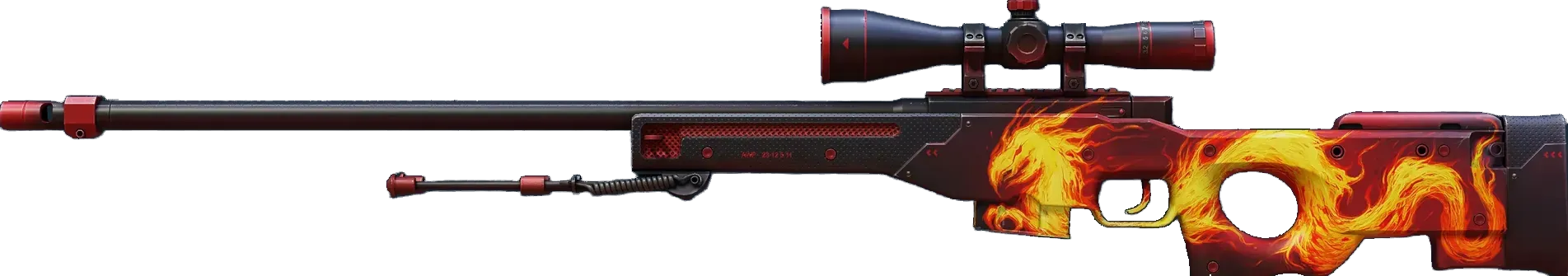 High risk and high reward, the infamous AWP is recognizable by its signature report and one-shot, one-kill policy. The Operation Wildfire logo has been hand painted over a black and red base. _The nail that sticks out gets the hammer_