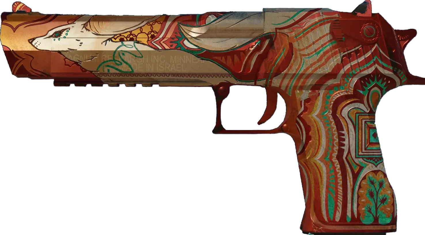 As expensive as it is powerful, the pistols/desert-eagle" class="text-orange-500 hover:underline underline-offset-4 decoration-orange-500/30">Desert Eagle is an iconic pistol that is difficult to master but surprisingly accurate at long range. It has been custom painted with a fennec fox on the barrel. The grip features teal and orange designs. _All the better to hear you with_